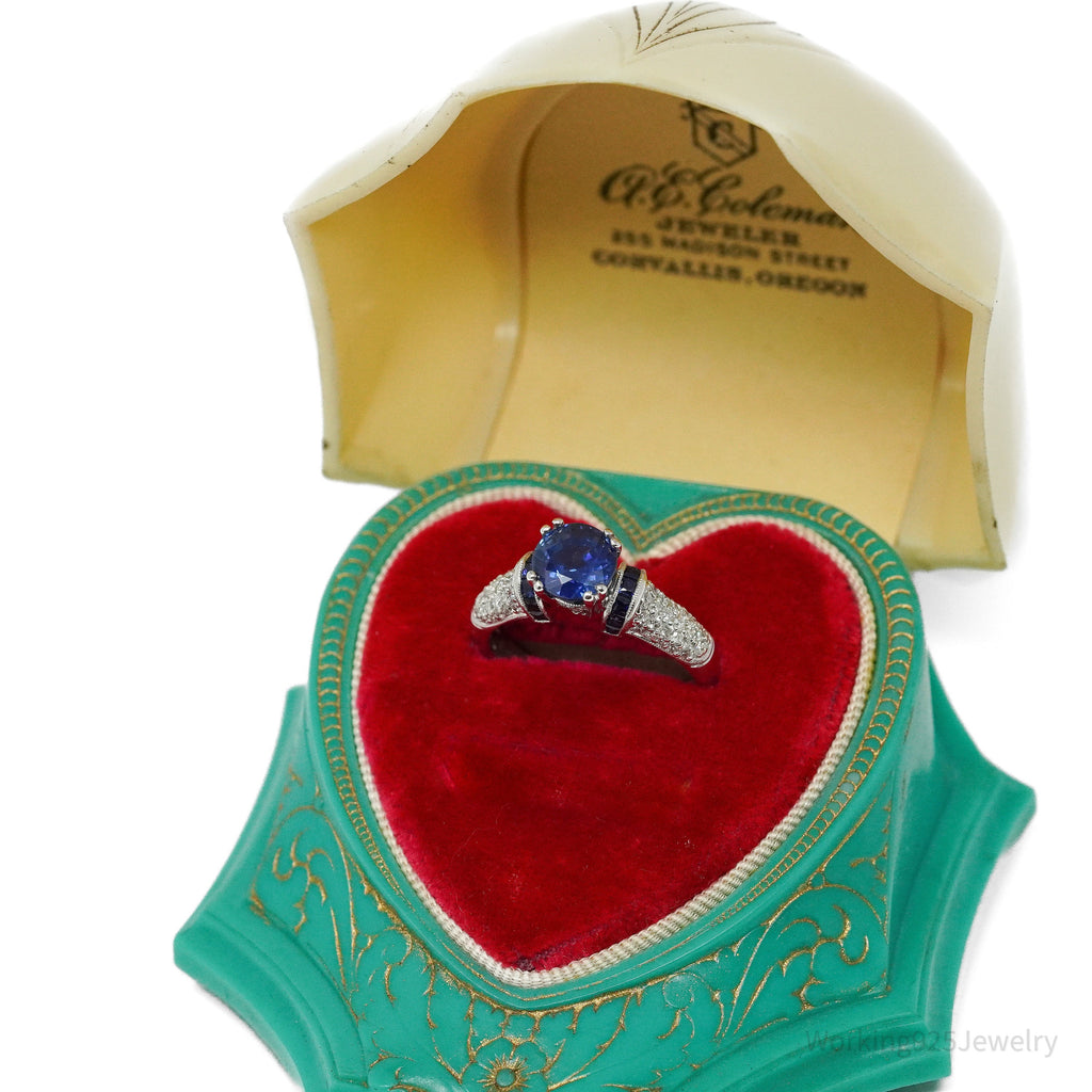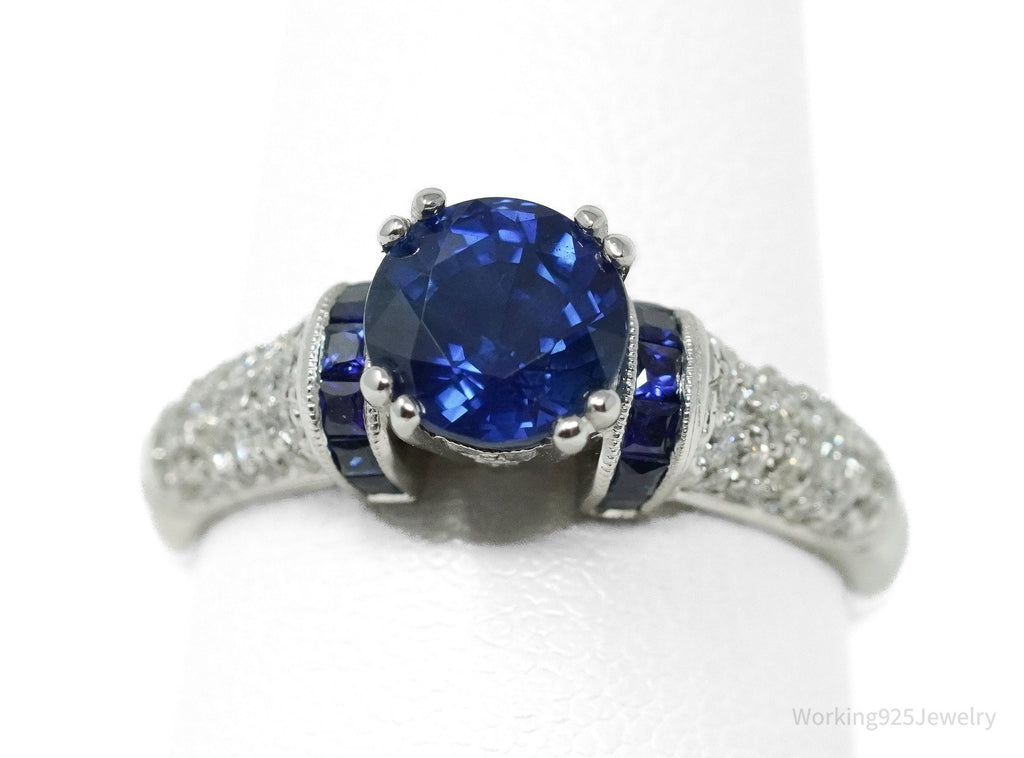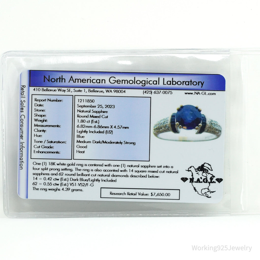 One (1) 18K white gold ring is centered with one (1) natural sapphire set into a four split prong setting. The ring is also accented with 14 square mixed cut natural sapphires and 62 round brilliant cut natural diamonds described below: 14 = 0.42 ctw (Est.) Dark Blue/Lightly Included 62 = 0.55 ctw (Est.) VS1 -VS2/F-G The ring weighs 4.39 grams. Research Retail Value: $7,650.00 Independent Appraisal Included. Pictured boxes are not included.