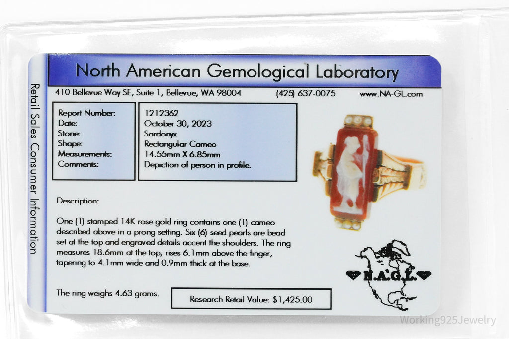 One (1) stamped 14K rose gold ring contains one (1) cameo in a prong setting. Six (6) seed pearls are bead set at the top and engraved details accent the shoulders. The ring measures 18.6mm at the top, rises 6.1mm above the finger, tapering to 4.1mm wide and 0.9mm thick at the base. The ring weighs 4.63 grams. Research Retail Value: $1,425.00