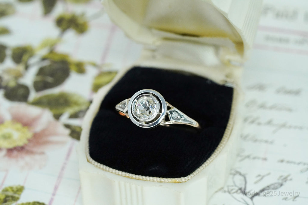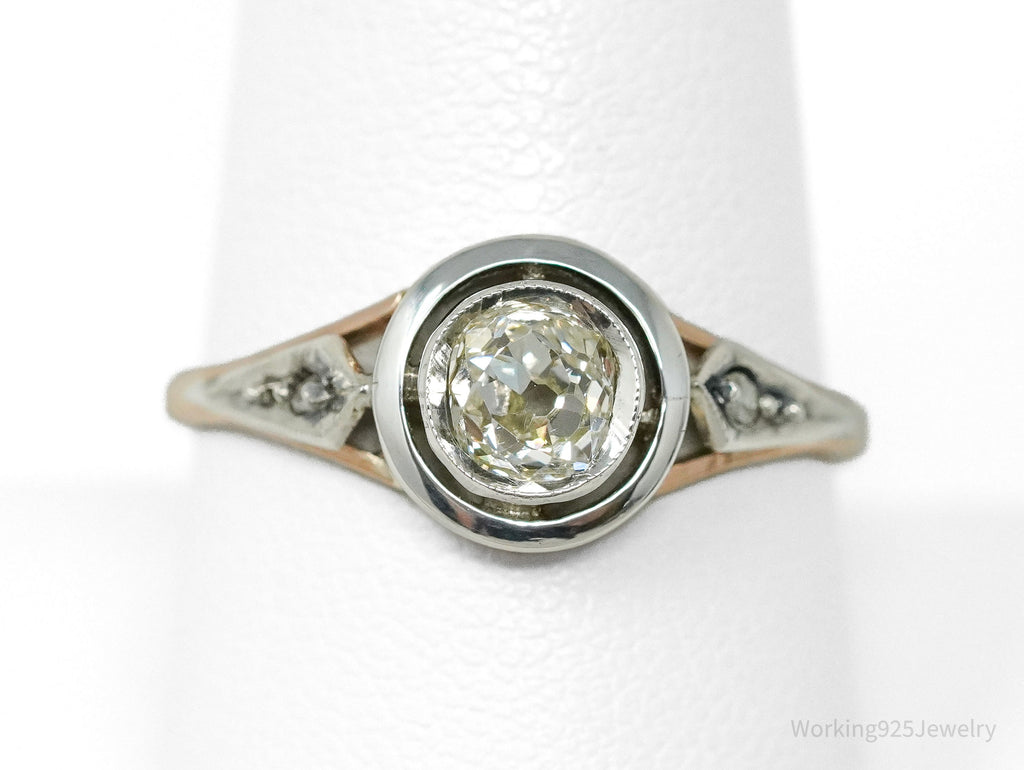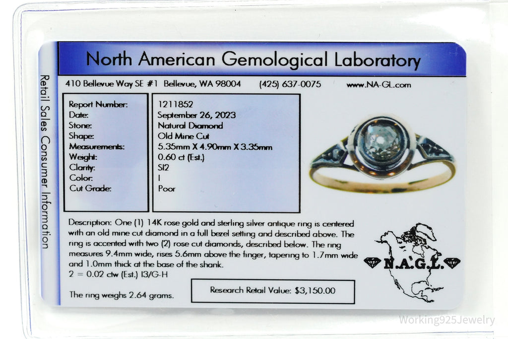 One (1) 14K rose gold and sterling silver antique ring is centered with an old mine cut diamond in a full bezel setting and described above. The ring is accented with two (2) rose cut diamonds, described below. The ring measures 9.4mm wide, rises 5.6mm above the finger, tapering to 1.7 mm wide and 1.0mm thick at the base of the shank. 2 = 0.02 ct (Est.) 13/G-H The ring weighs 2.64 grams.