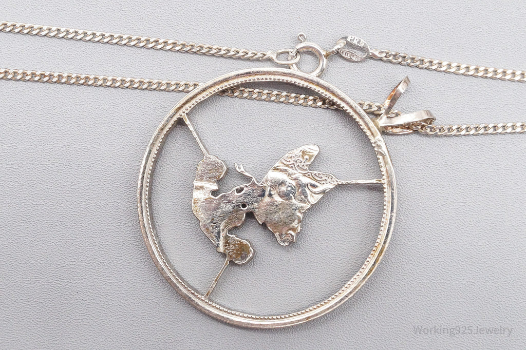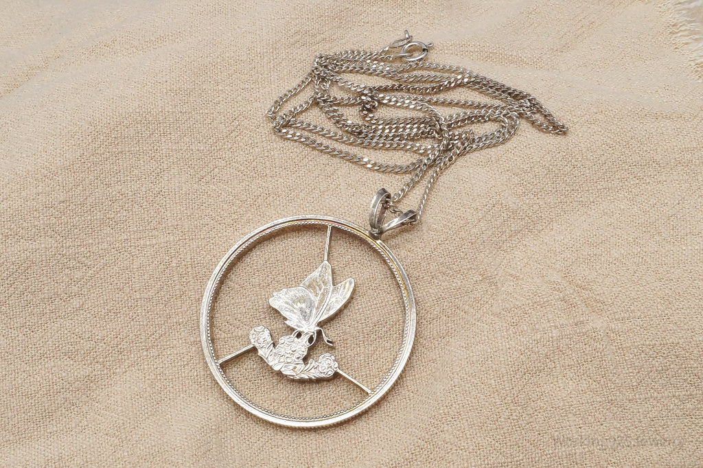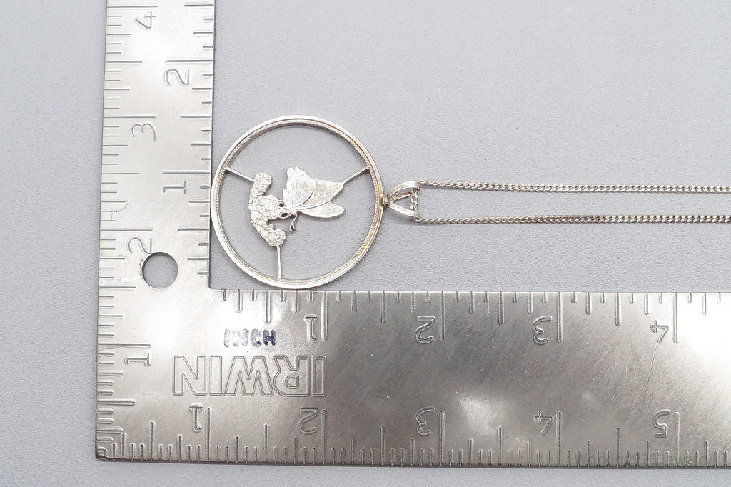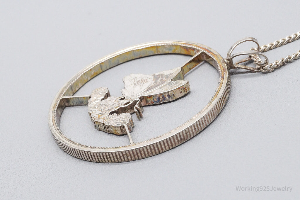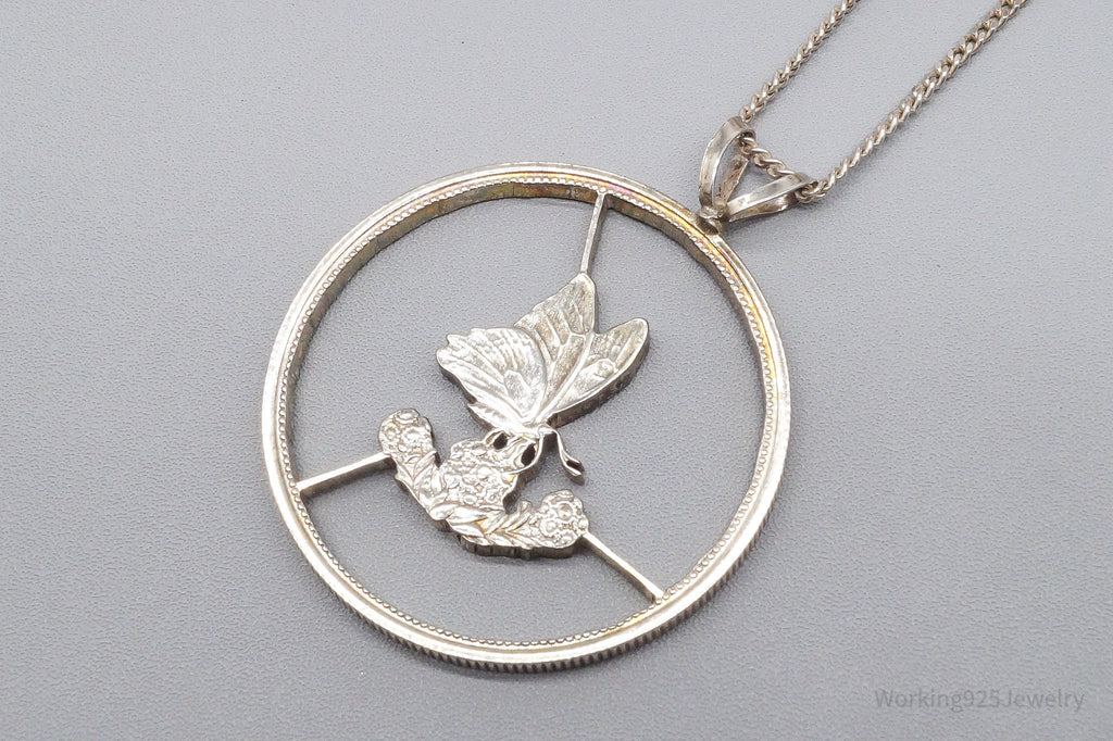 Antique Butterfly Cut Silver Coin Turned Pendant Sterling Silver Necklace 24"