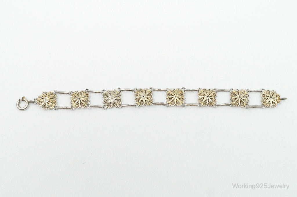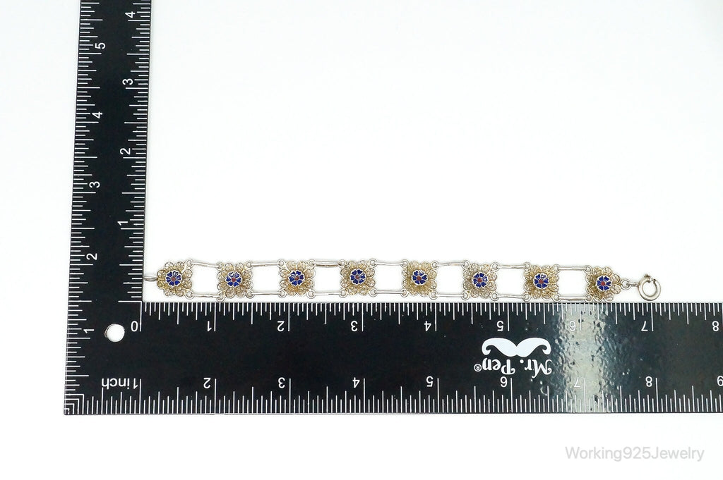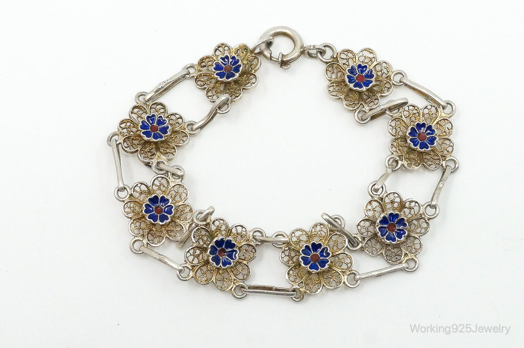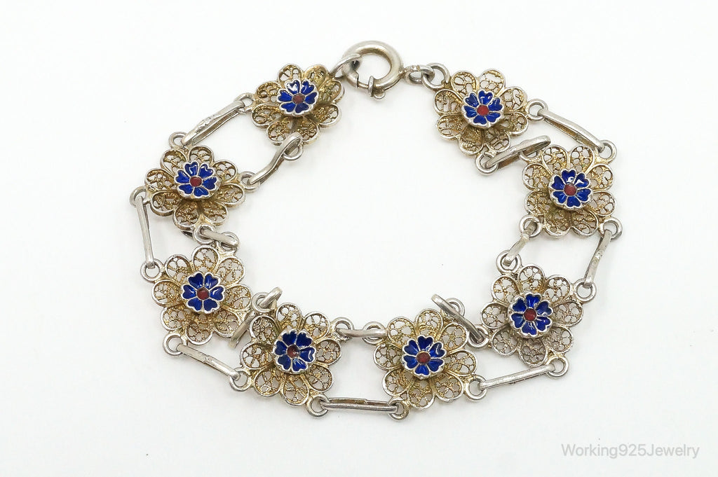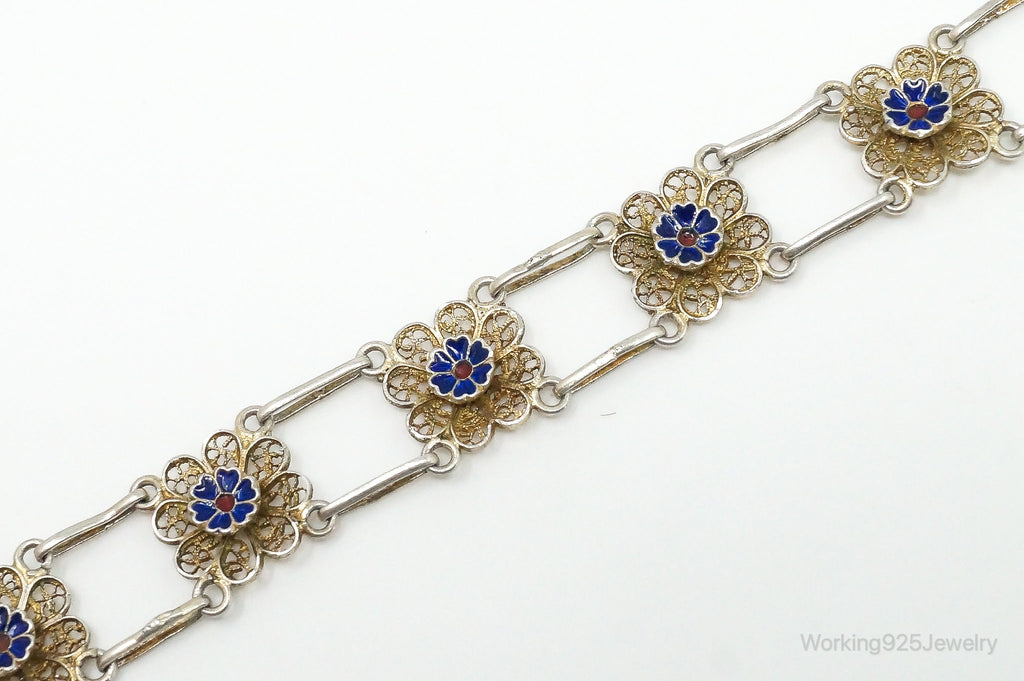 Antique Enamel Flowers 835 Silver Filigree Bracelet