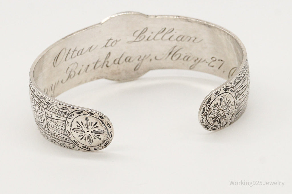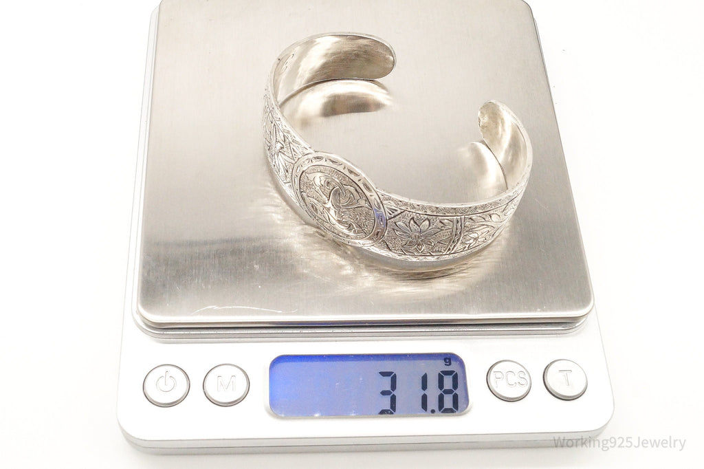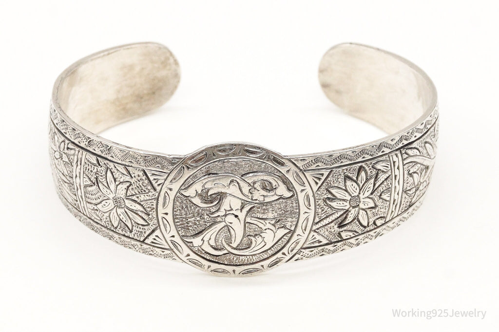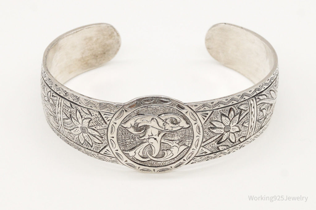 Antique Floral Motif Etched Sterling Silver Cuff Bracelet