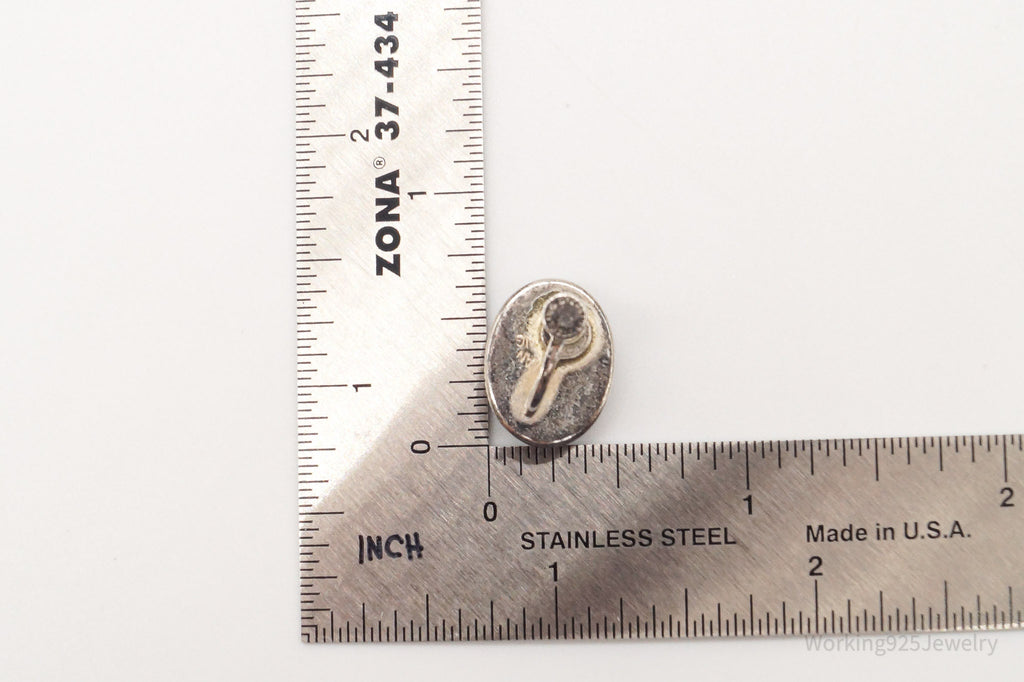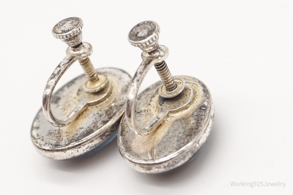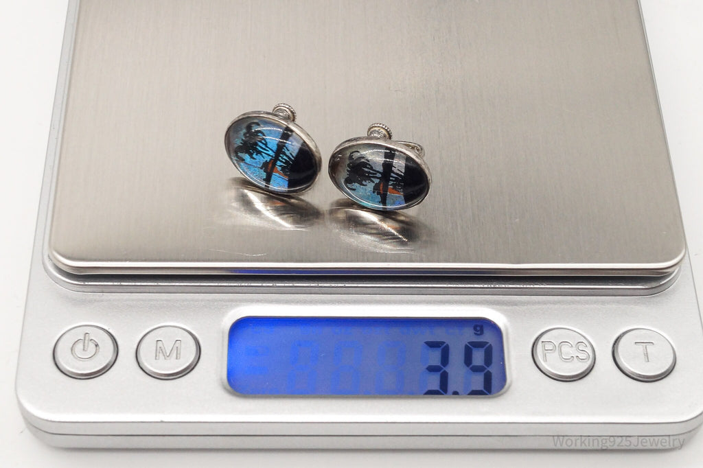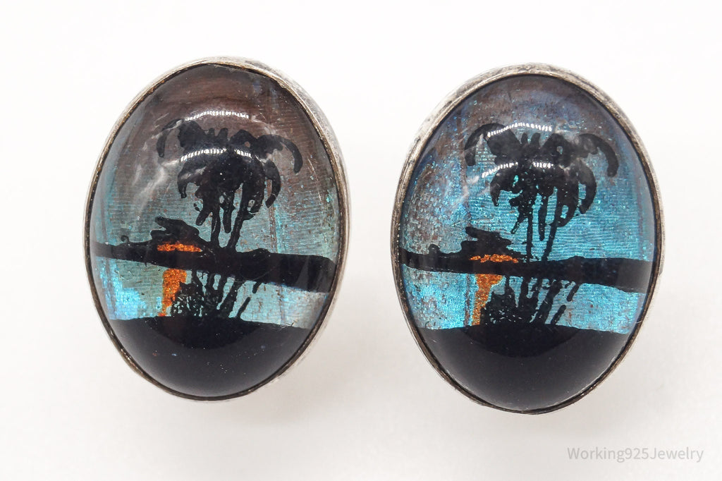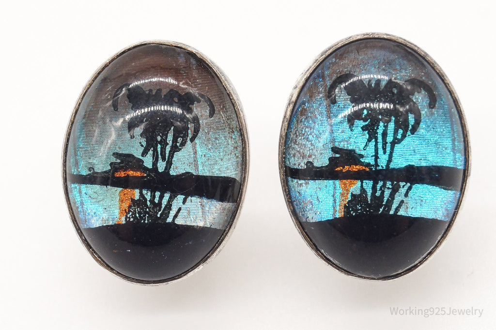 Antique Hoffman Painted Butterfly Wing Beach Scene Sterling Silver Earrings