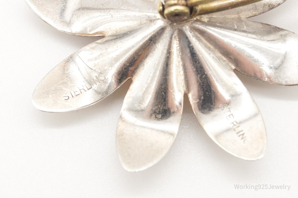 Antique Large Orange Stone Flower Sterling Silver Brooch Pin