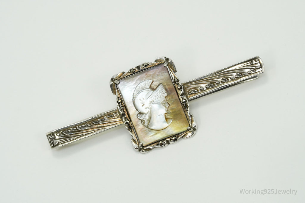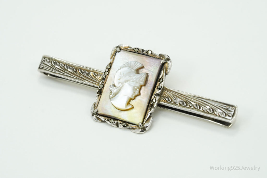 Antique Victorian 800 Silver Mother of Pearl Cameo And Marcasite Warrior Tie Clip