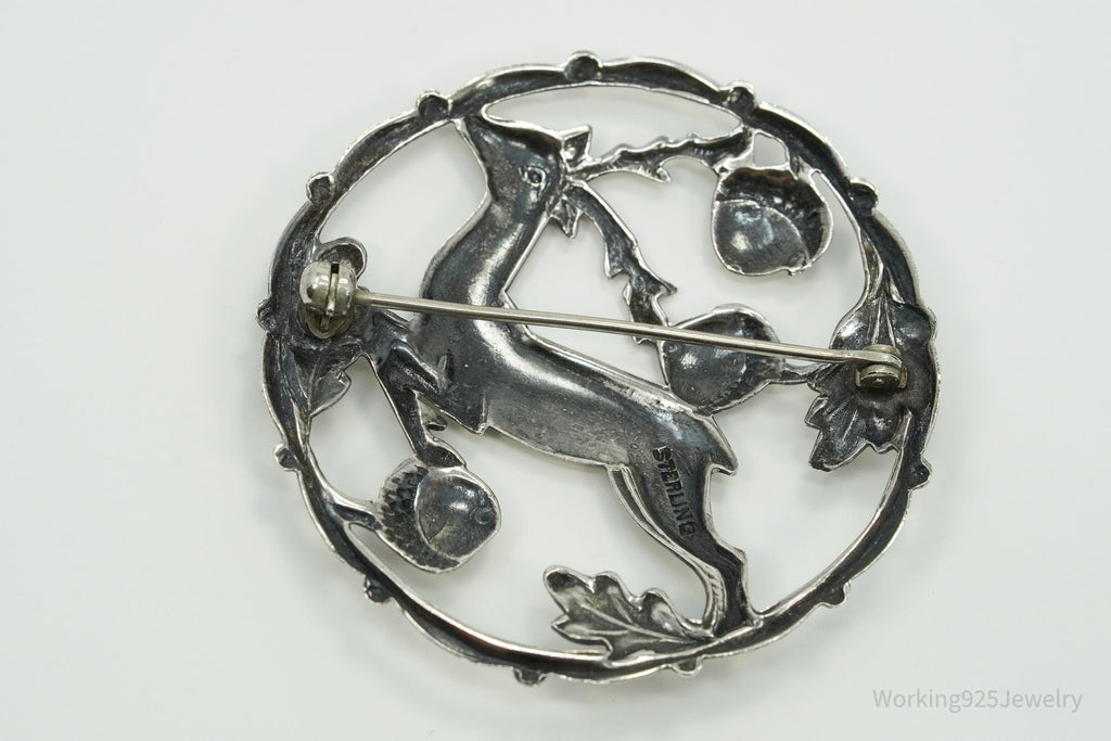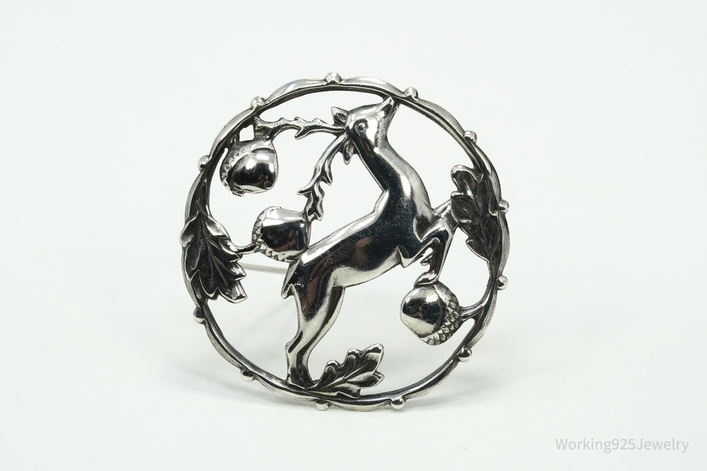 Large Antique Deer & Acorns Sterling Silver Brooch Pin