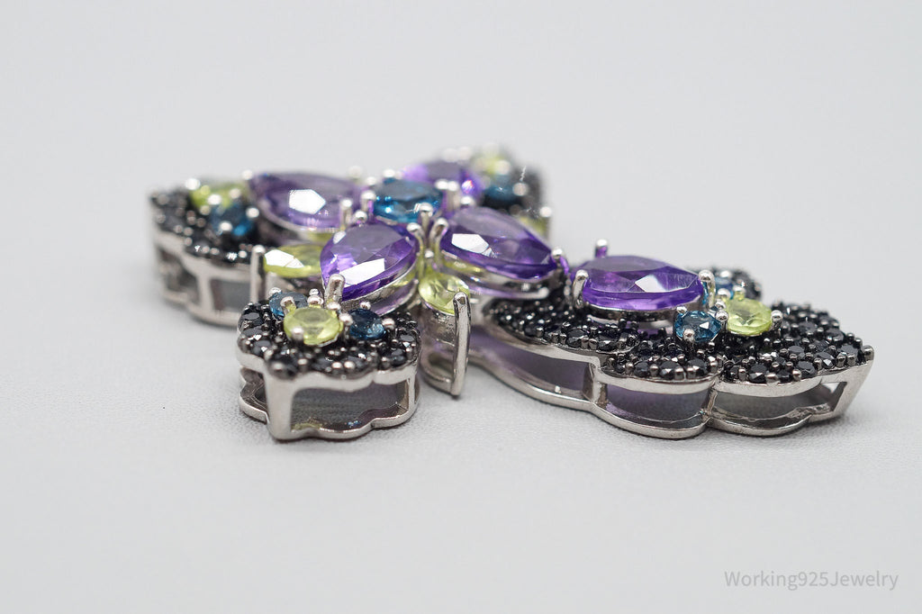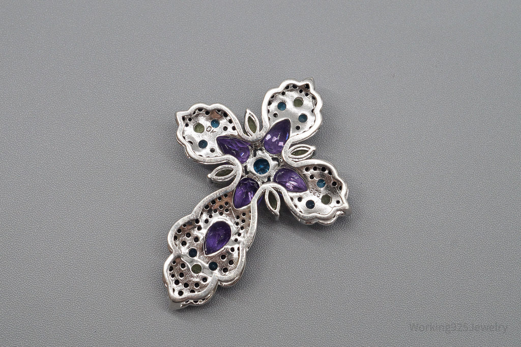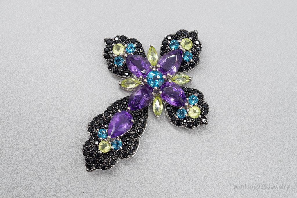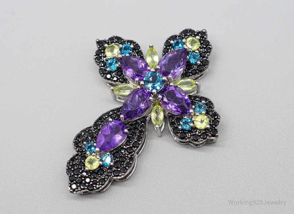 Large JTV DK Multi Gemstone Rhodium Over Sterling Silver Cross Pendant - African Amethyst - Black Spinel - Manchurian Peridot - London Blue Topaz