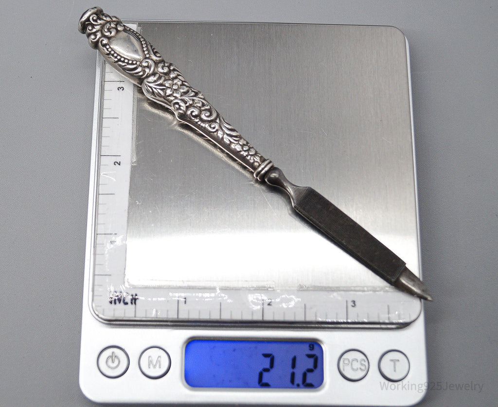 Large Rare Antique Repousse Purple Glass End Sterling Silver Nail File