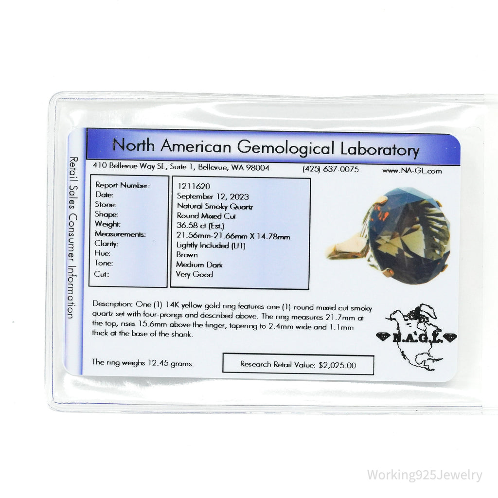 One (1) 14K yellow gold ring features one (1) round mixed cut smoky quartz set with four-prongs. The ring measures 21.7mm at the top, rises 15.6mm above the finger, tapering to 2.4mm wide and 1.1mm thick at the base of the shank. The ring weighs 12.45 grams. Research Retail Value: $2,025.00 Independent Appraisal Included. Pictured boxes are not included.