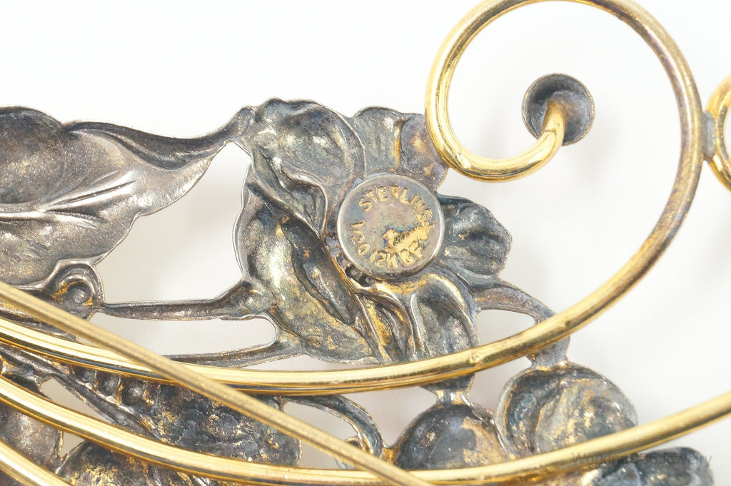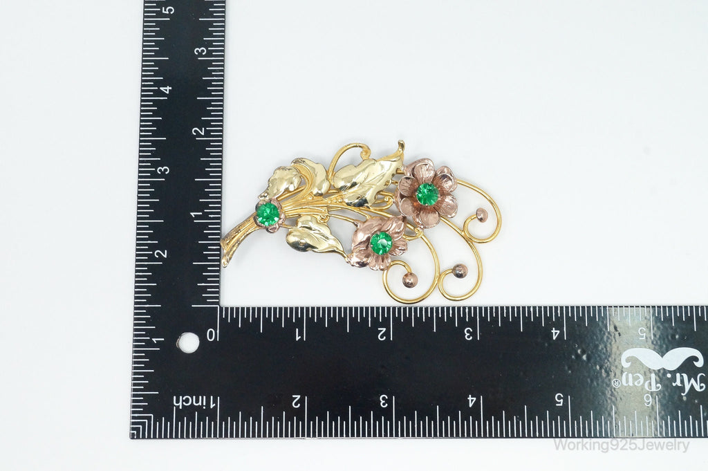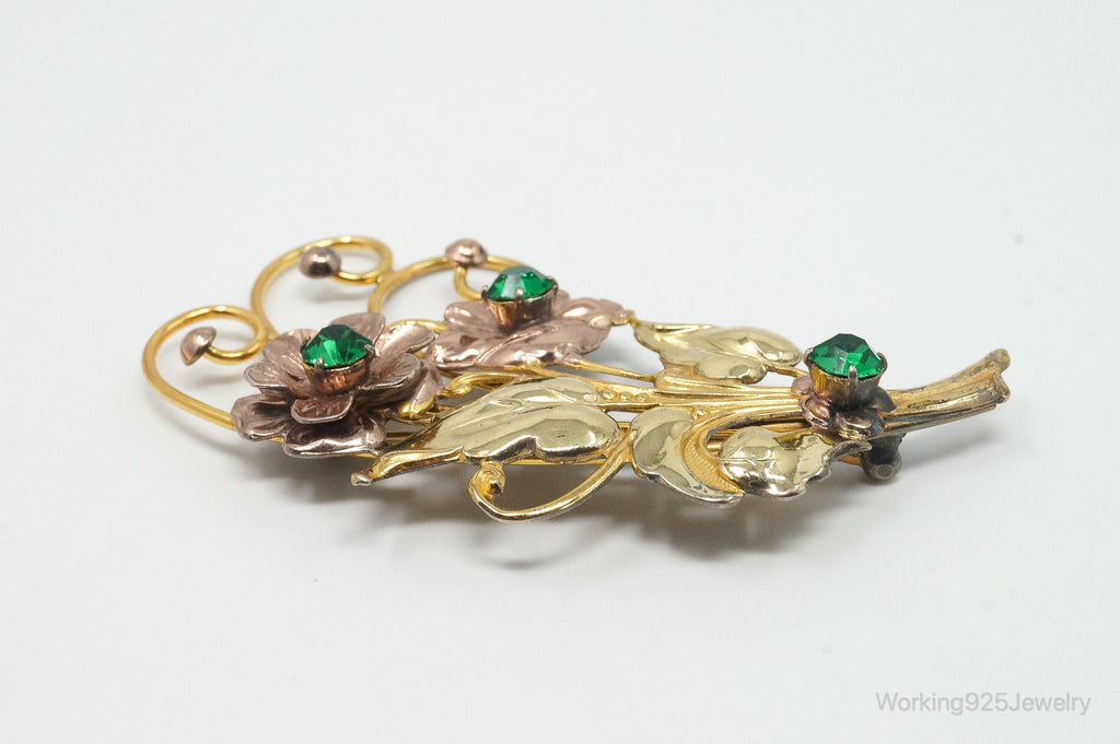 Large Vintage Green Rhinestone Flowers 12K Gold Filled Sterling Silver Brooch