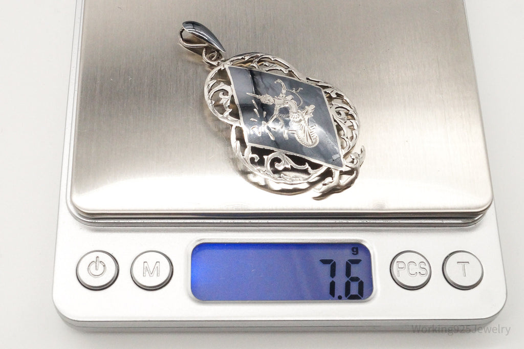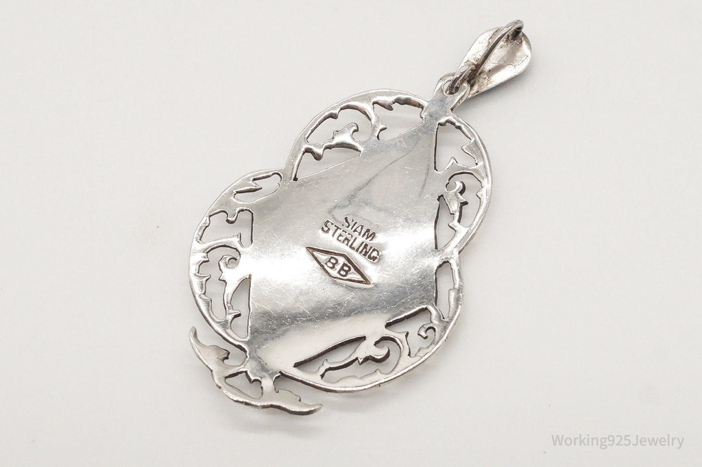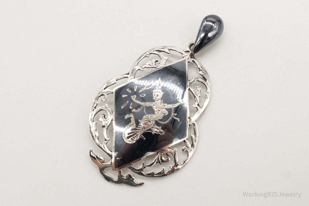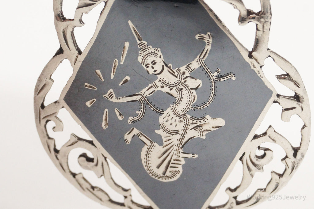 Large Vintage Siam Black Enamel Goddess Dancer Sterling Silver Pendant
