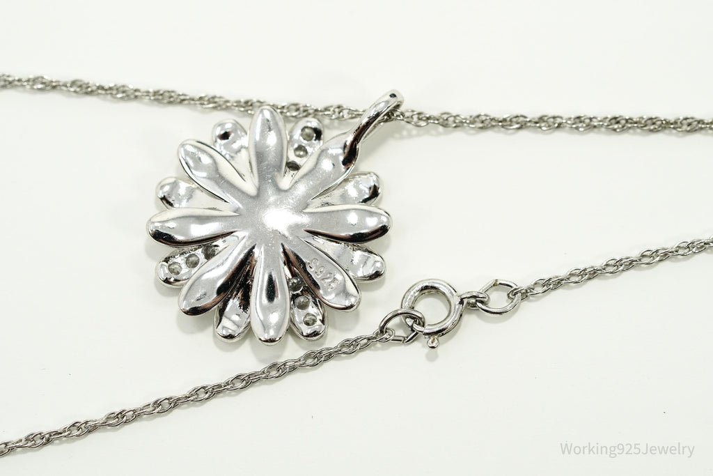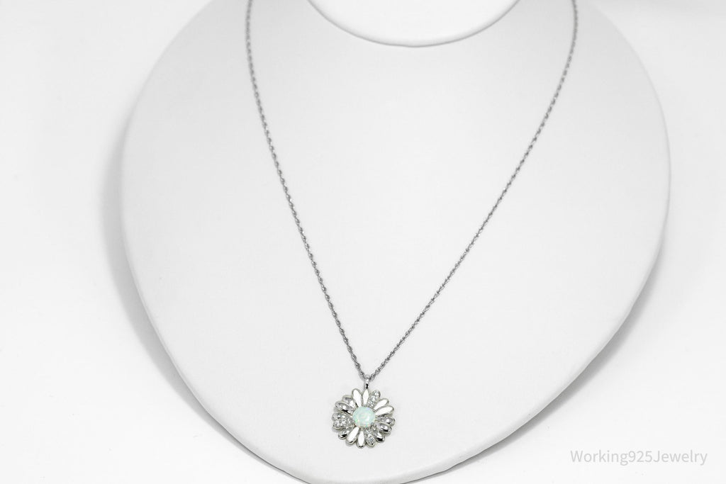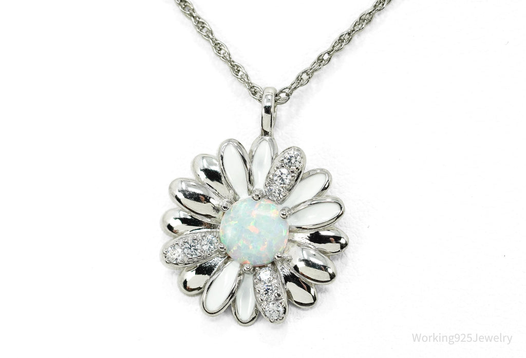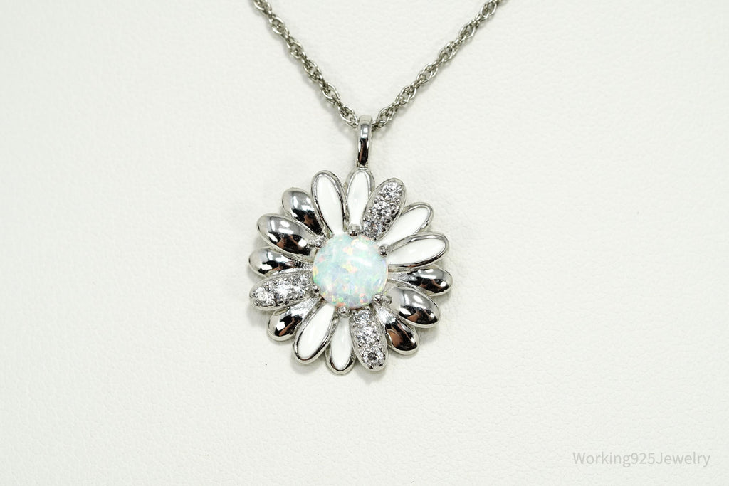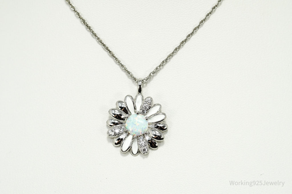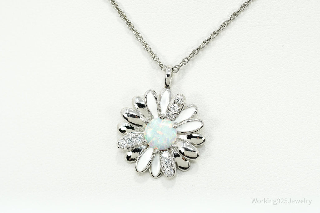 Opal & Cubic Zirconia Sterling Silver White Enamel Flower Chain Necklace 18"