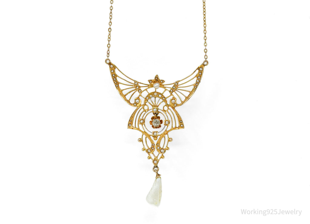 One (1) 14K yellow gold necklace is post set with the river pearl described above. The necklace is accented with forty-six (46) bead set, seed pearls measuring 0.90mm-2.65mm with a white body color. The center of the necklace is six-prong set with one (1) round old European cut diamond described below. The center of the necklace measures 57.1 mm long and the necklace has an overall length of 17 inches long and is finished with a spring ring clasp. 1 = 0.10 ct (Est) SI1/F