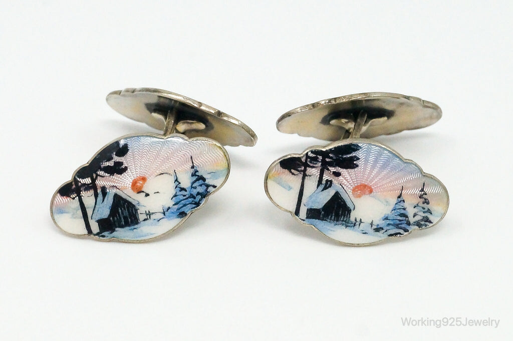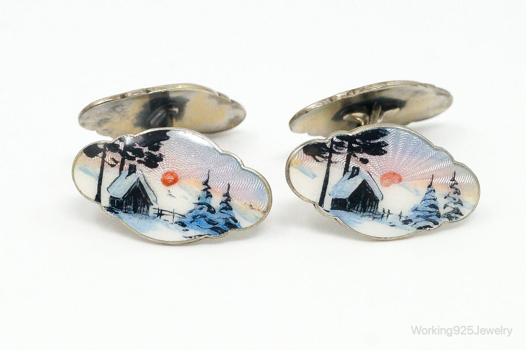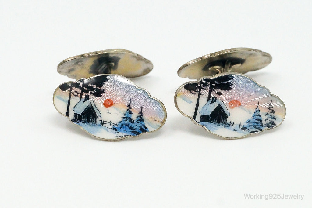RARE Vintage Aksel Holmsen Enamel Cabin Scene Sterling Silver Cufflinks