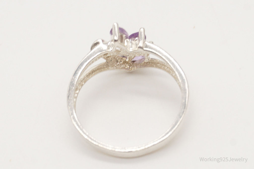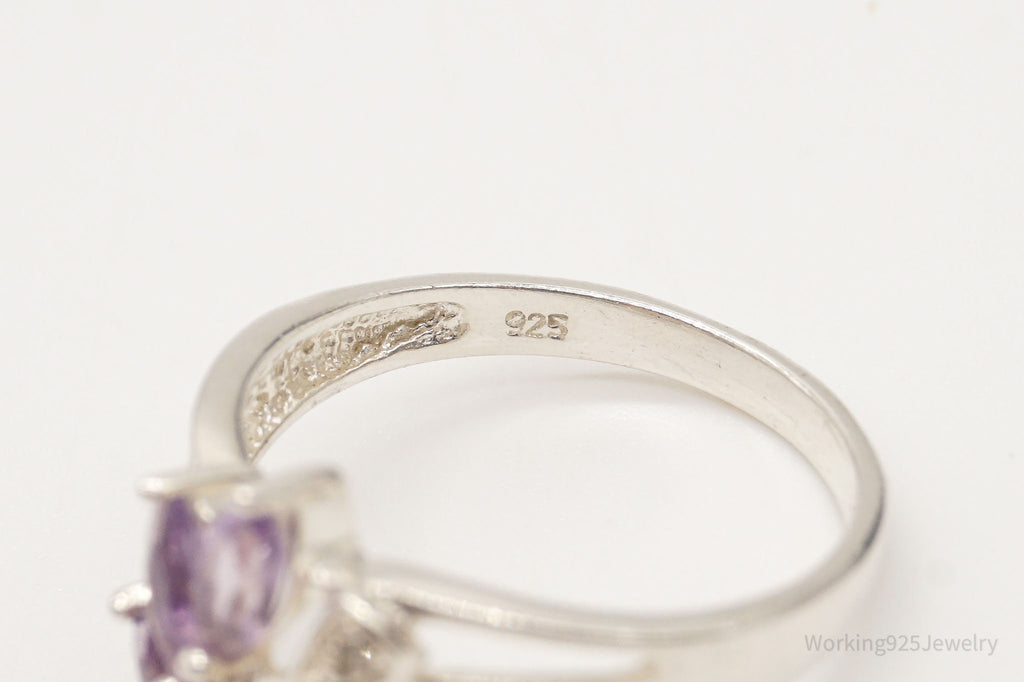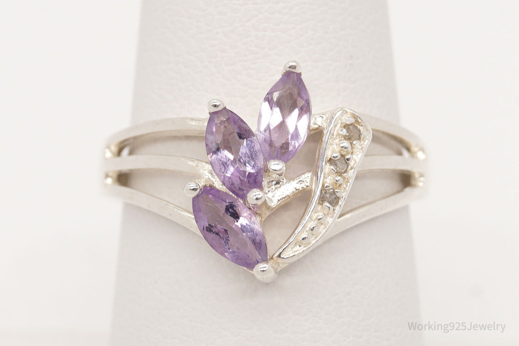 Vintage Amethyst Three Diamond Sterling Silver Ring - Size 8