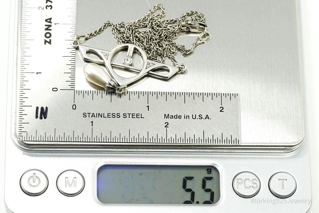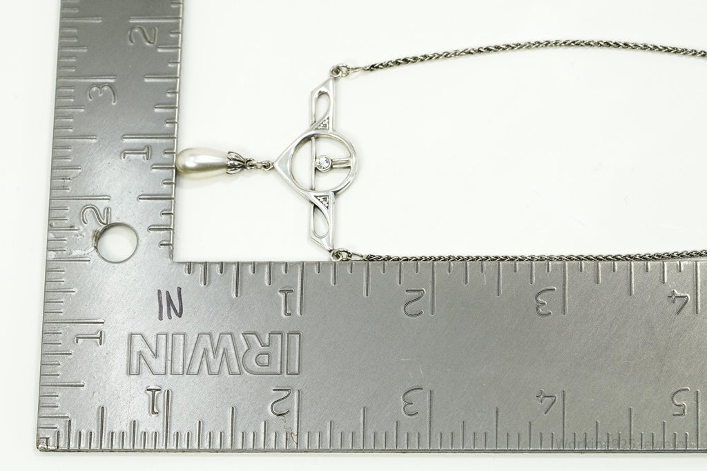 Vintage Art Nouveau Style Pearl & Swarovski Crystal Sterling Silver Necklace 15"