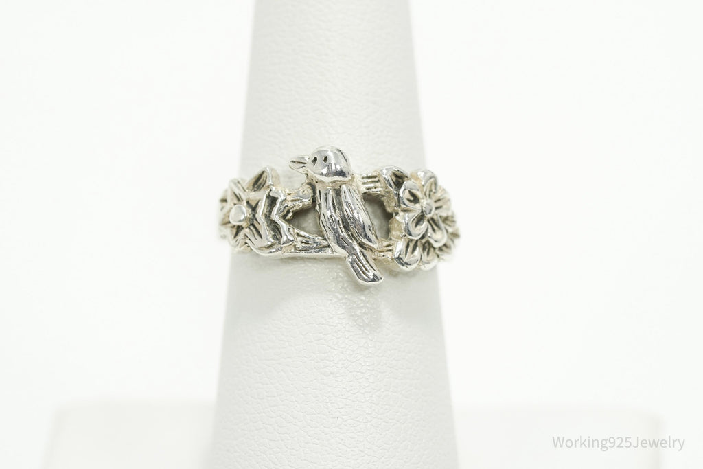 Vintage Bird & Flowers Sterling Silver Ring - Size 6.75