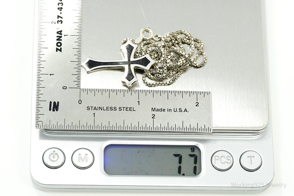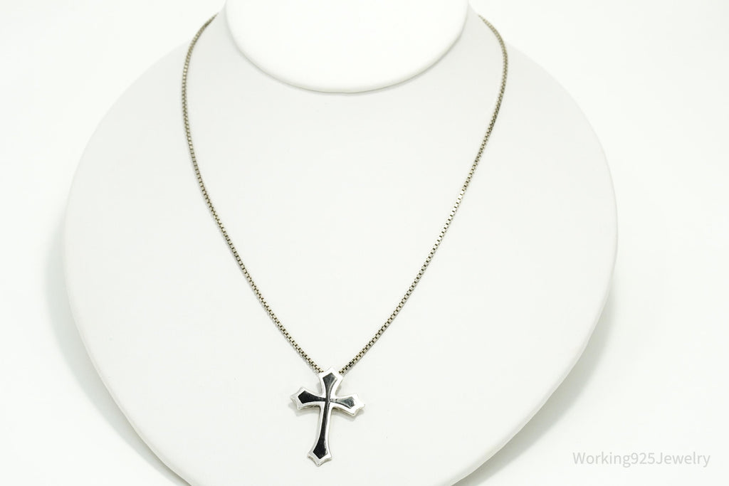Vintage Black Enamel Inlay Sterling Silver Cross Necklace - 19"