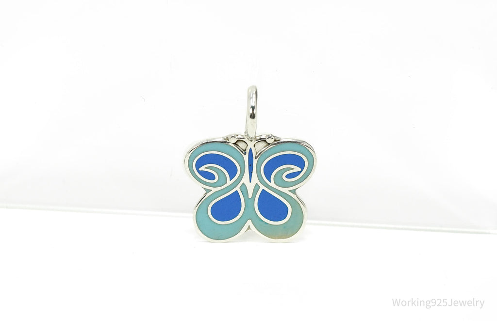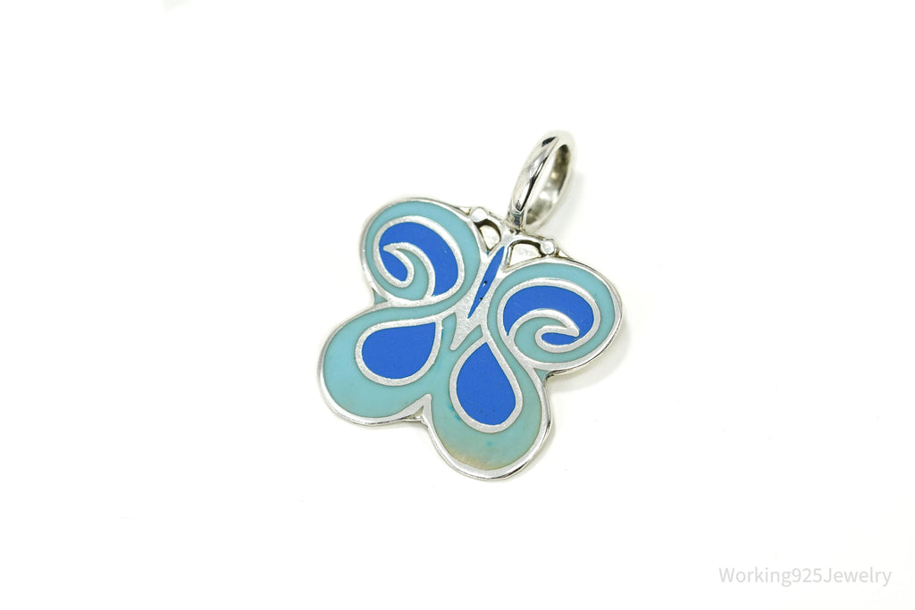 Vintage Blue Enamel Butterfly Silver Necklace Pendant