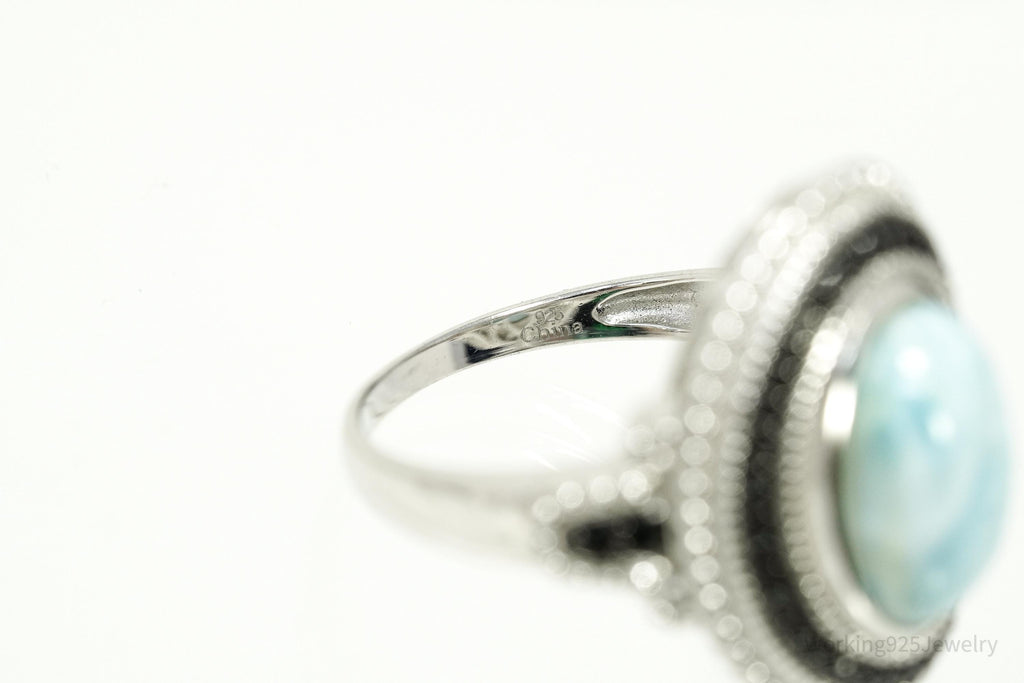 This bold vintage ring showcases a dreamy Larimar cabochon, prized for its soft blue hues reminiscent of Caribbean waters. Larimar is a rare gemstone found only in the Dominican Republic, making it highly sought after by collectors around the world. Its natural variations of sky and sea tones are beautifully highlighted by a halo of faceted black spinel, creating a striking contrast that emphasizes the stone's luminous beauty. Set in sterling silver with a substantial band, this piece blends elegance with statement-making style - a wearable treasure with both rarity and character.