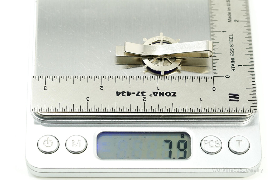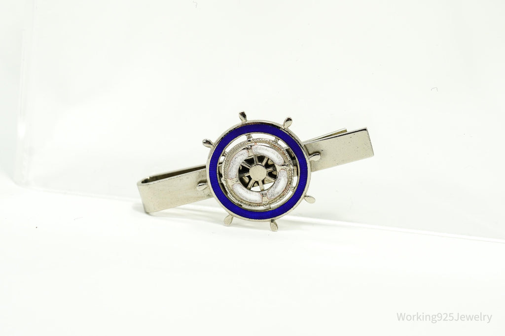 Vintage Blue & White Enamel Ship Wheel Sterling Silver Brooch Pin 1.75"
