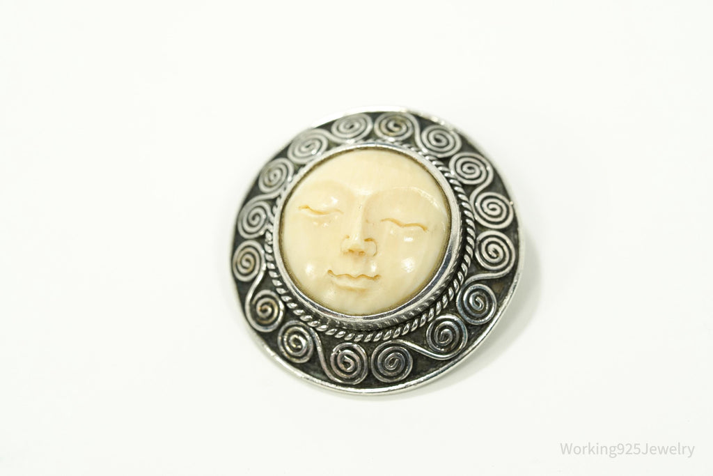 Vintage Carved Sleeping Moon Face Sterling Silver Pendant