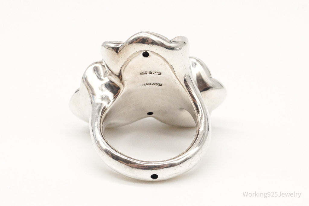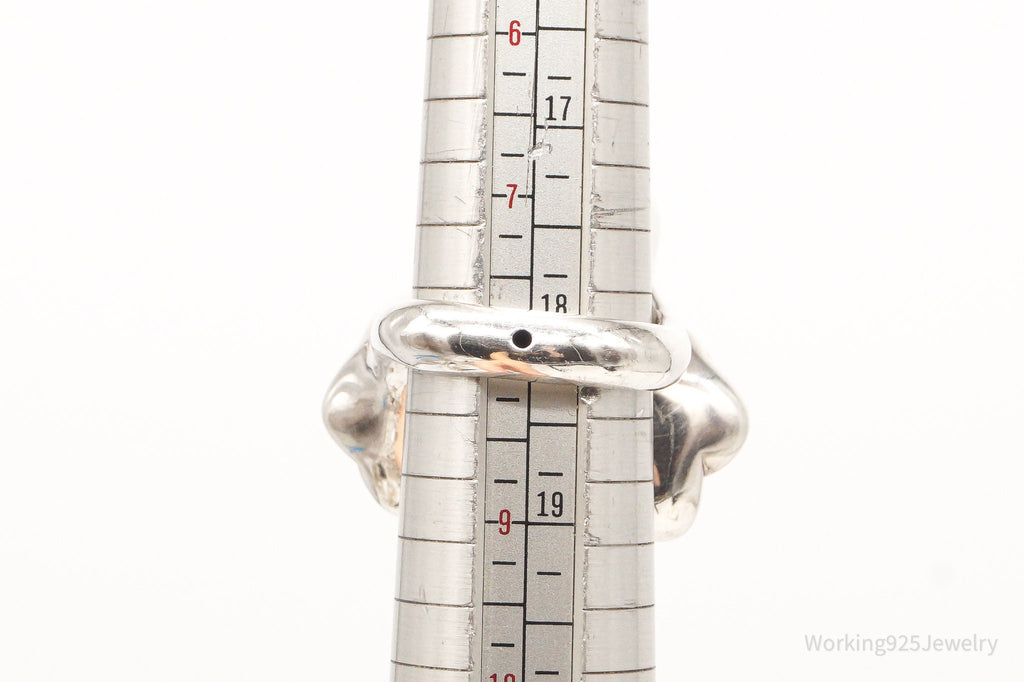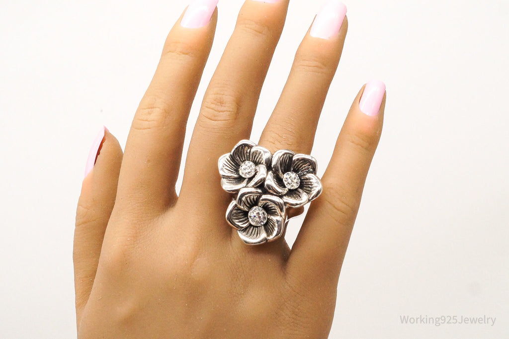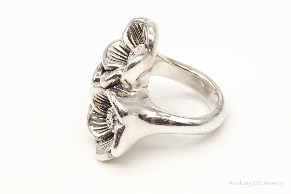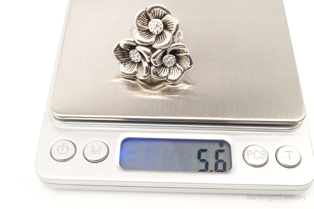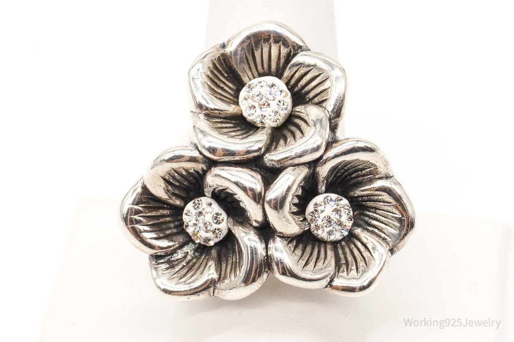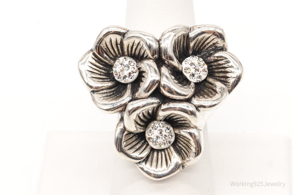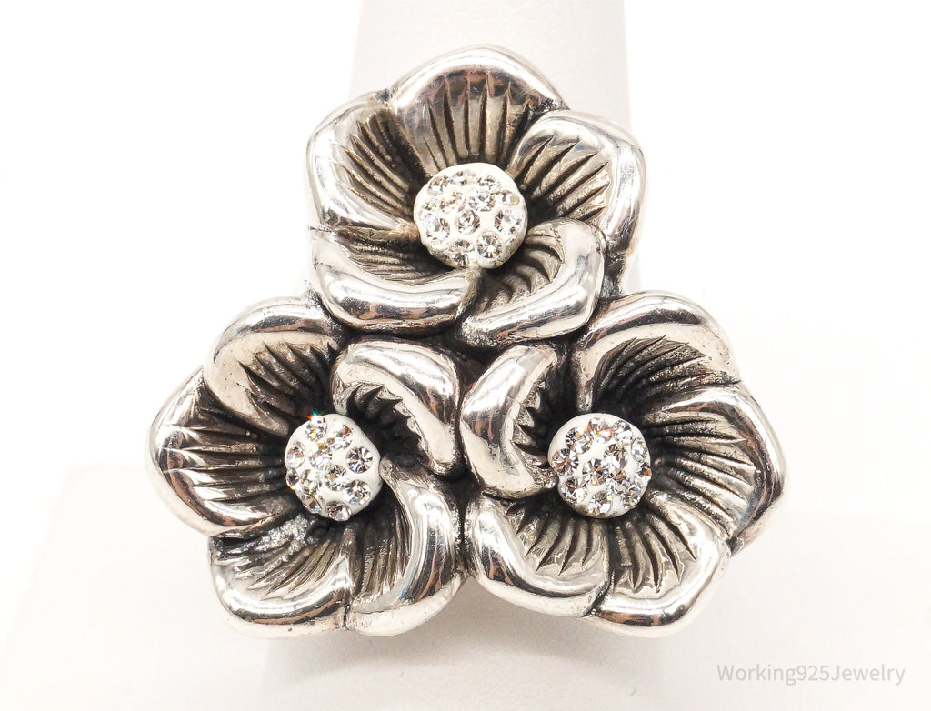 Vintage Crystal Flowers Sterling Silver Hollow Ring - Size 8