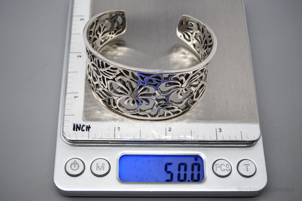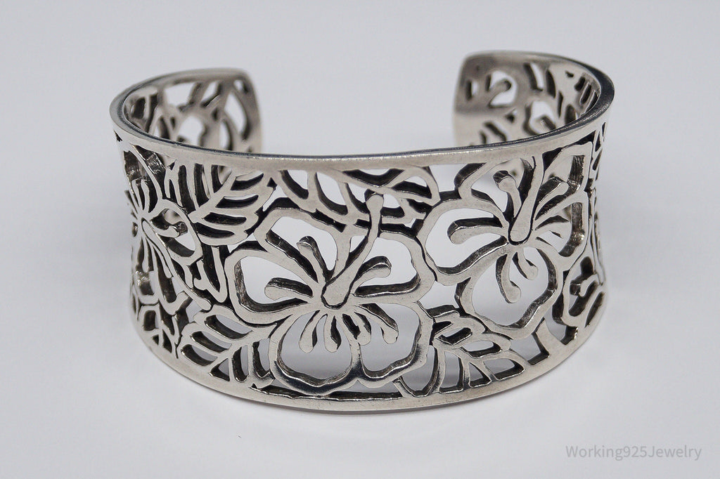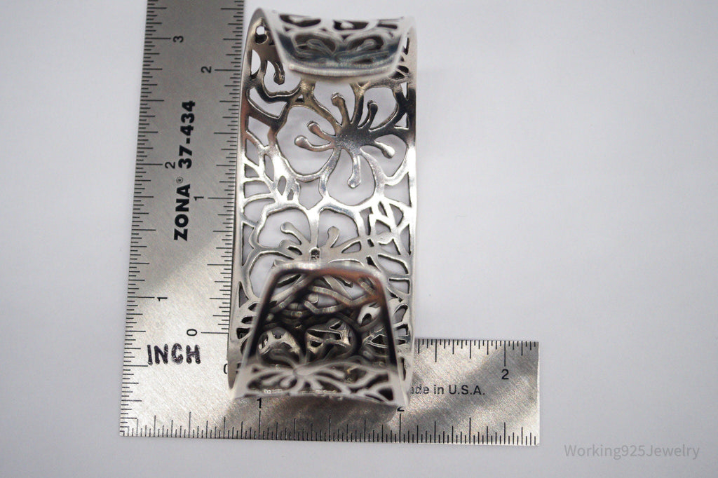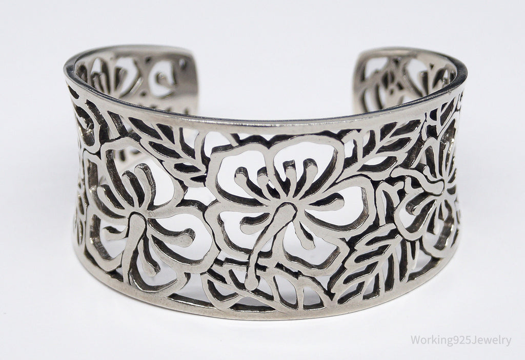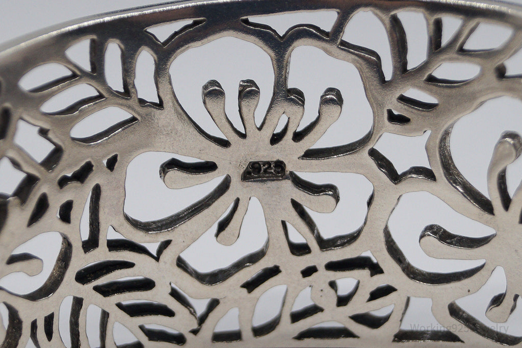 Vintage Cutout Floral Pattern Sterling Silver Cuff Bracelet 6.5"