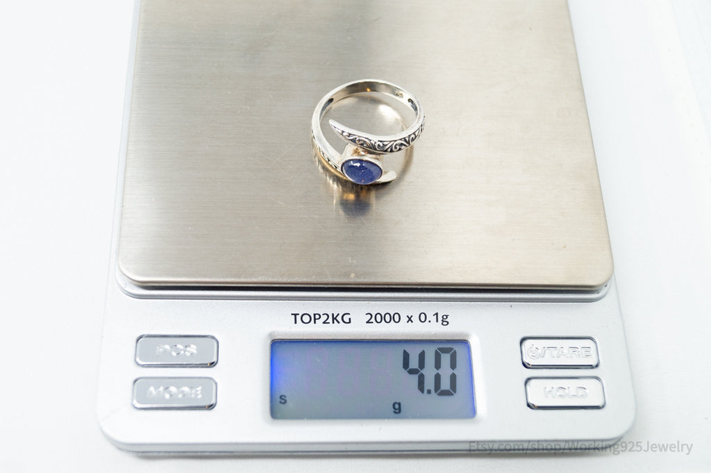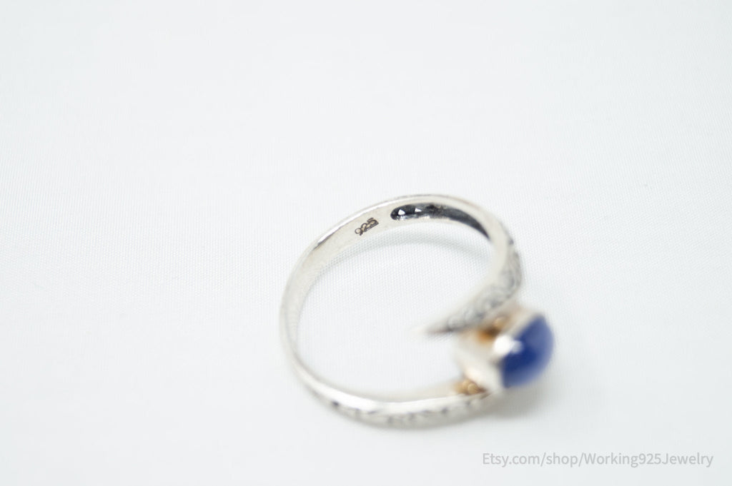 Vintage Deco Style Blue Gemstone Swirl Scroll Sterling Silver Ring - Size 10