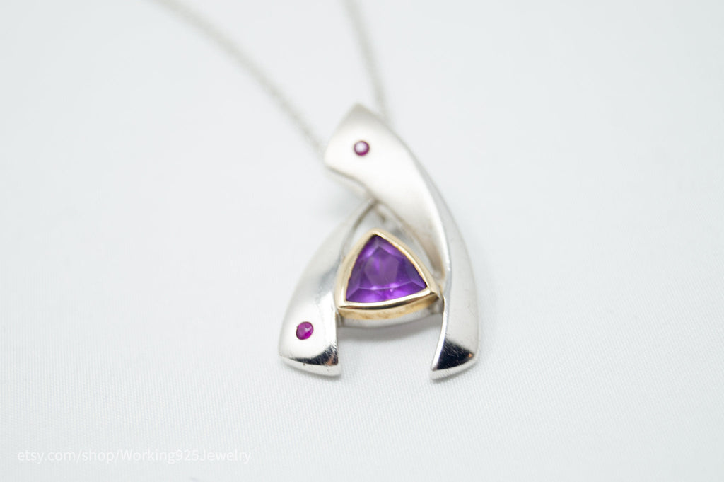 Vintage Designer 14K Gold Amethyst Ruby Art Deco Sterling Silver Necklace