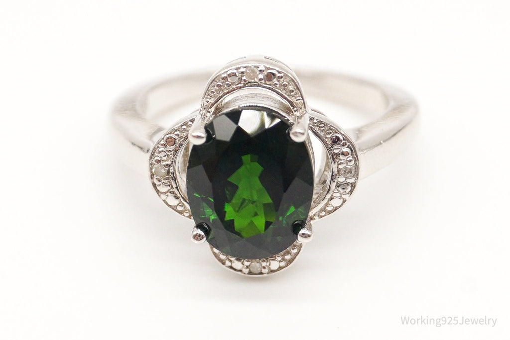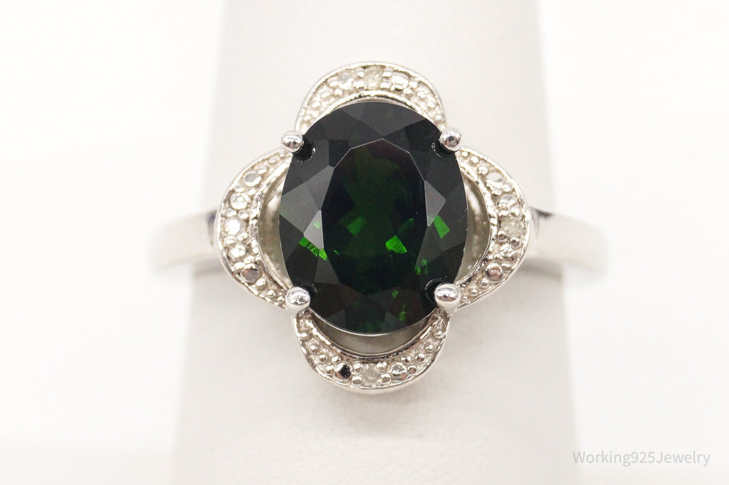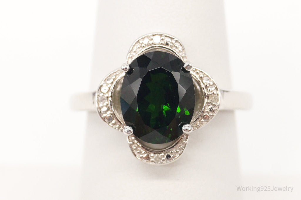 Vintage Designer BBJ Green Stone 4 Diamond Sterling Silver Ring - Size 6.75