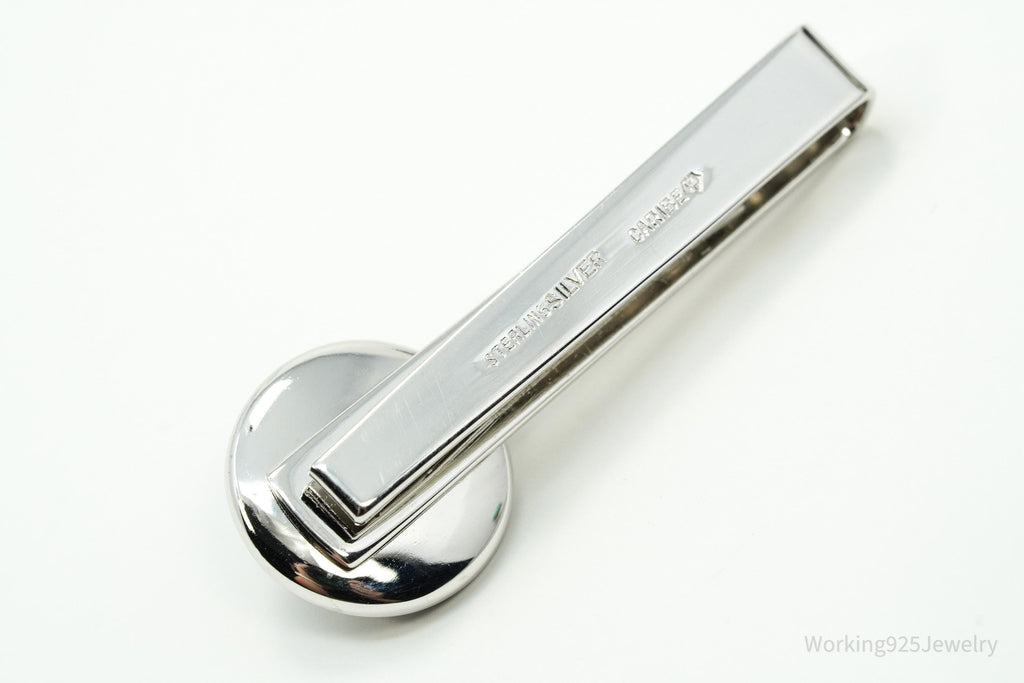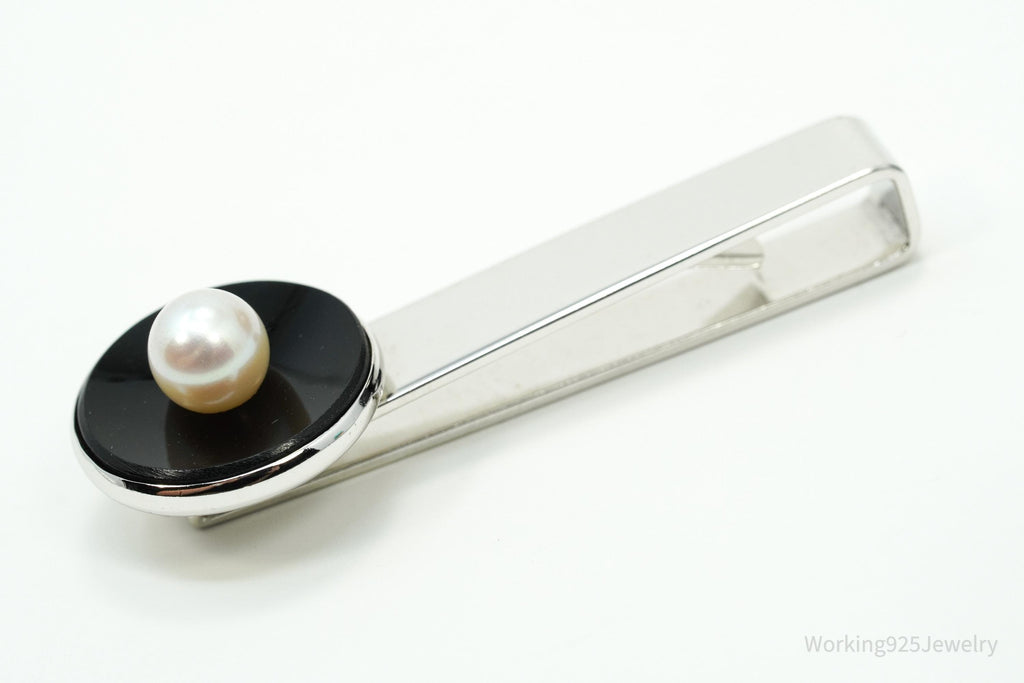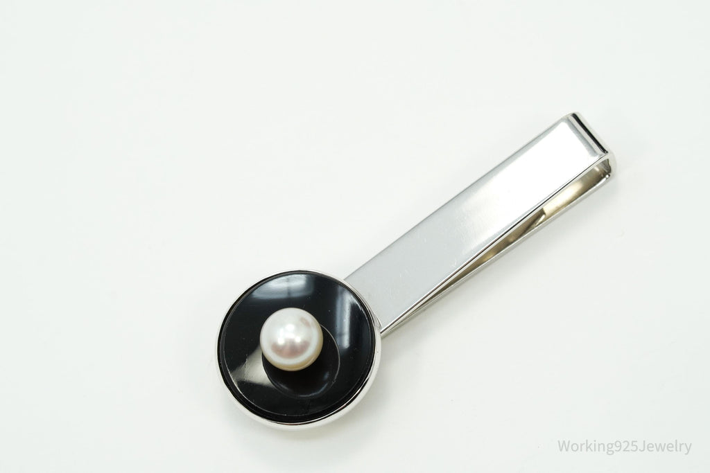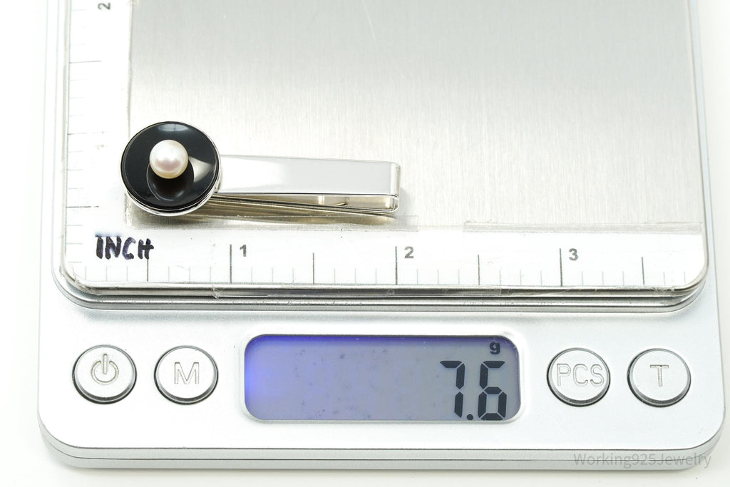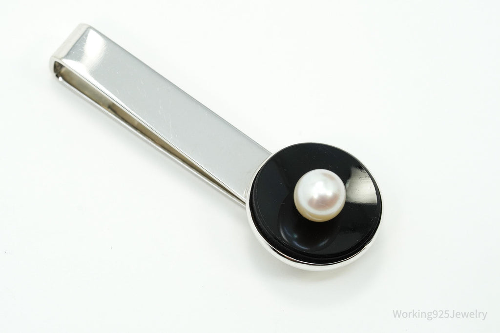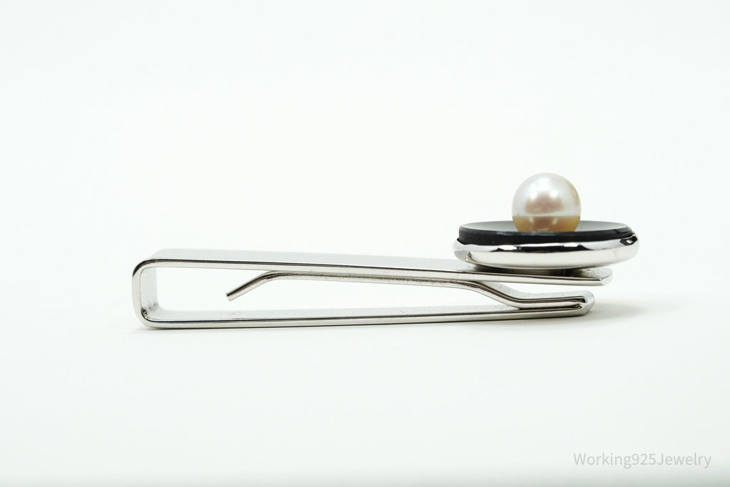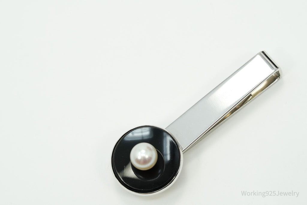 Vintage Designer CARIBE Pearl & Onxy Sterling Silver Tie Bar Clip