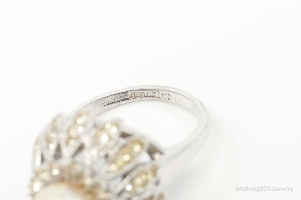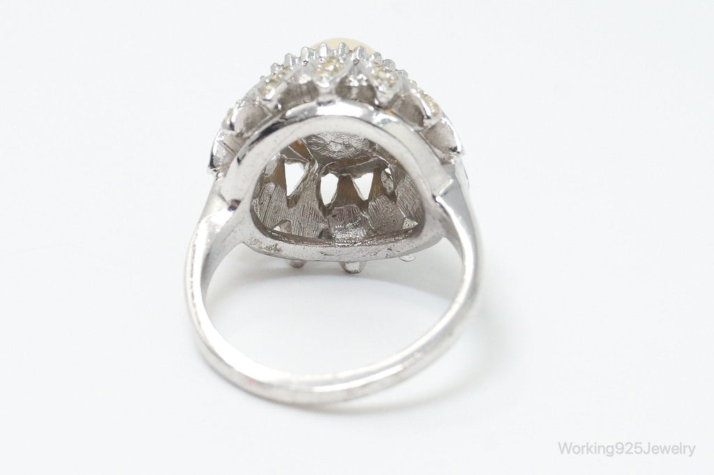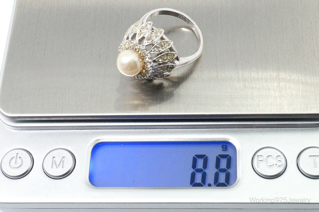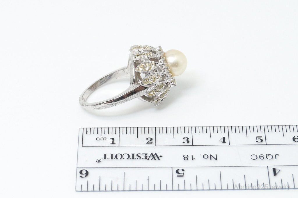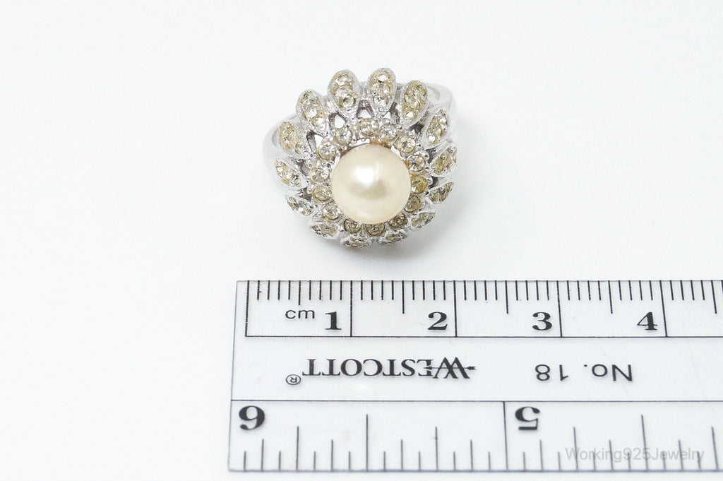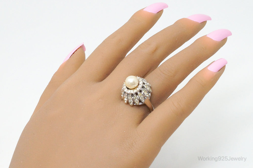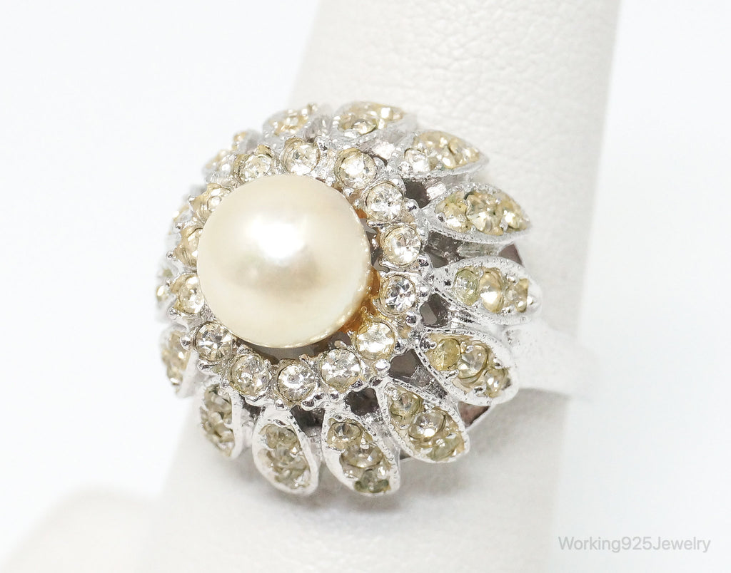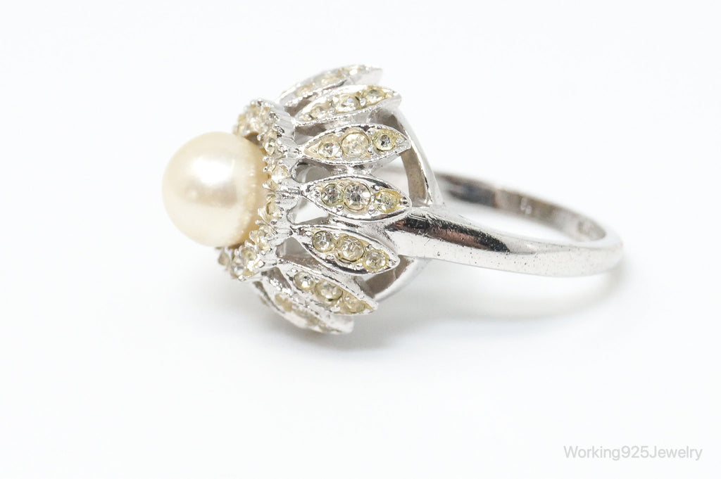 Vintage Designer ESPO Faux Pearl Rhinestone Sterling Silver Ring - SZ 6.75