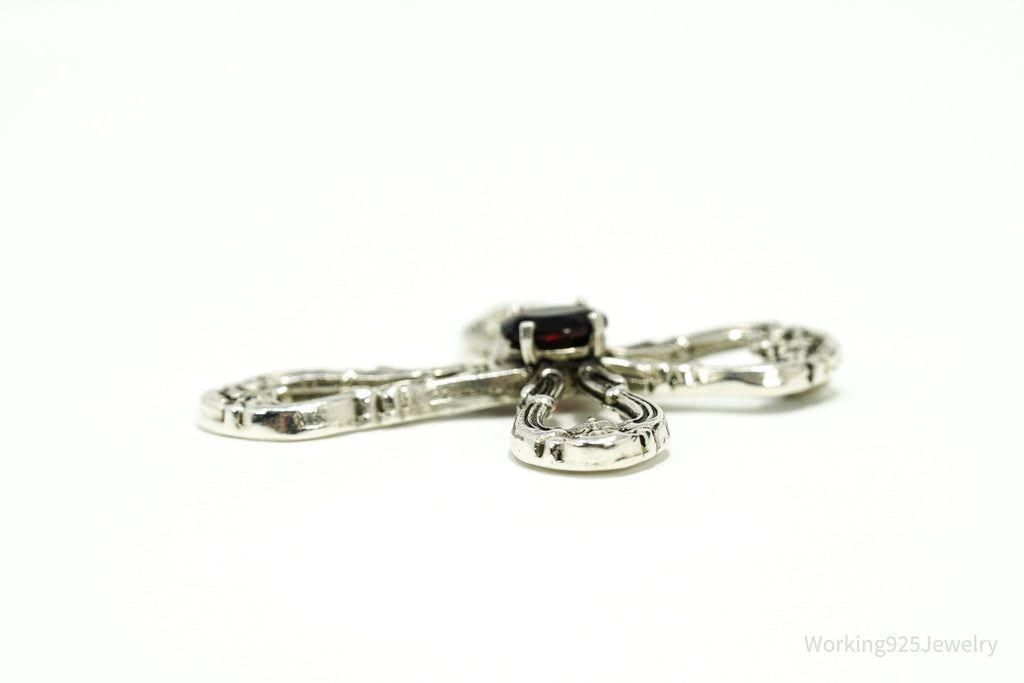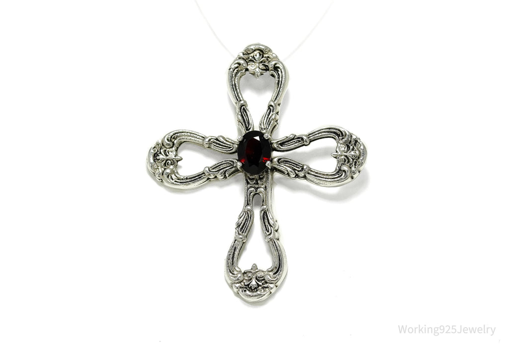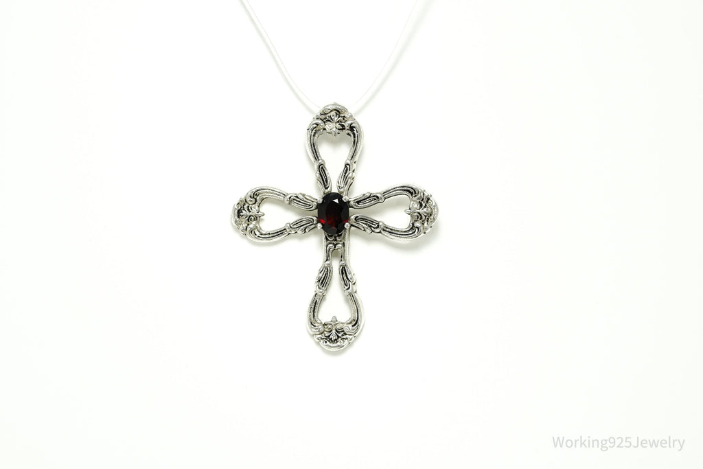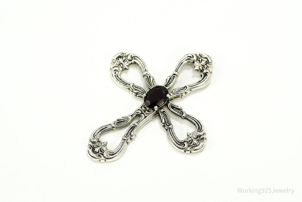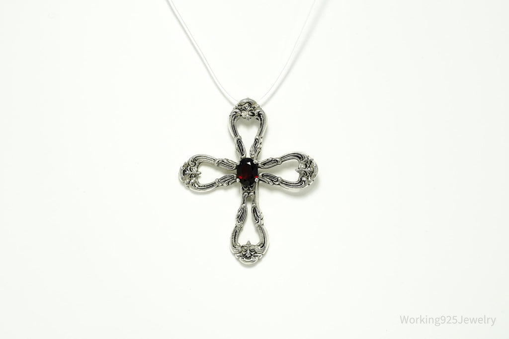 Vintage Designer Gorham Garnet Ornate Sterling Silver Cross Necklace Pendant