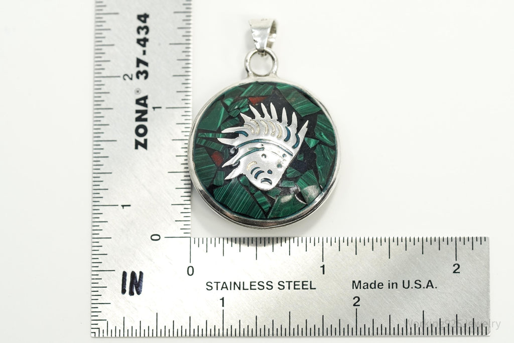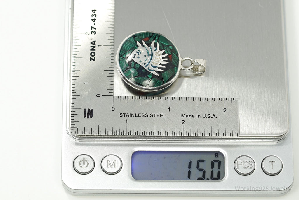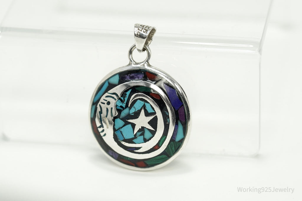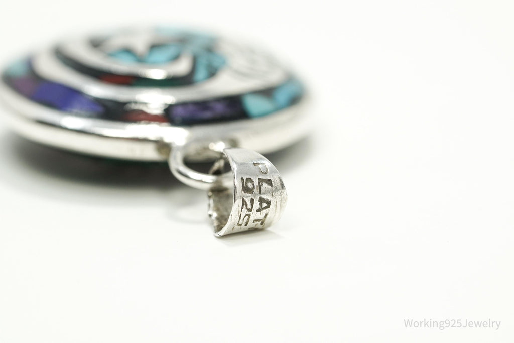 Vintage Double Sided Aztec Mayan Multi Gem Inlay Sterling Silver Pendant 1 11/16"