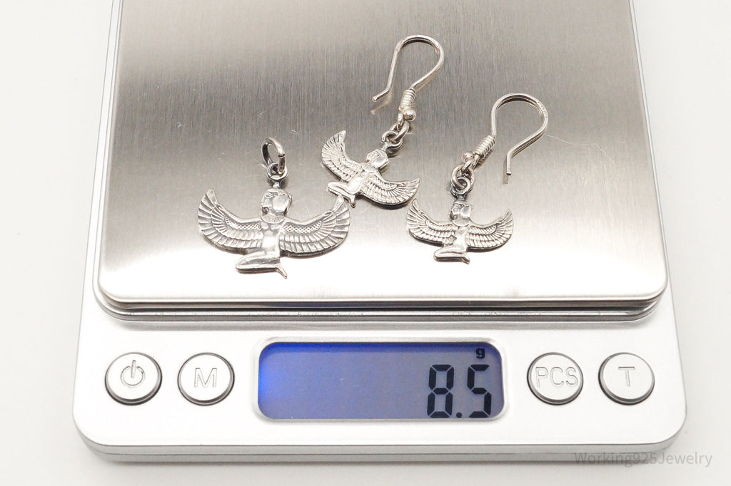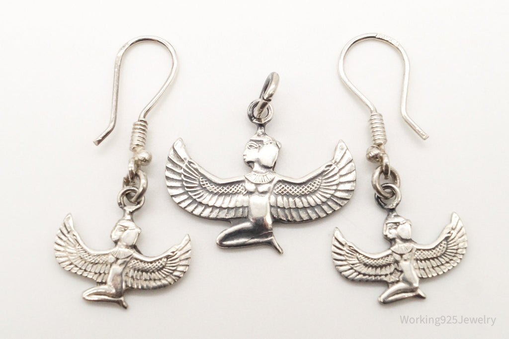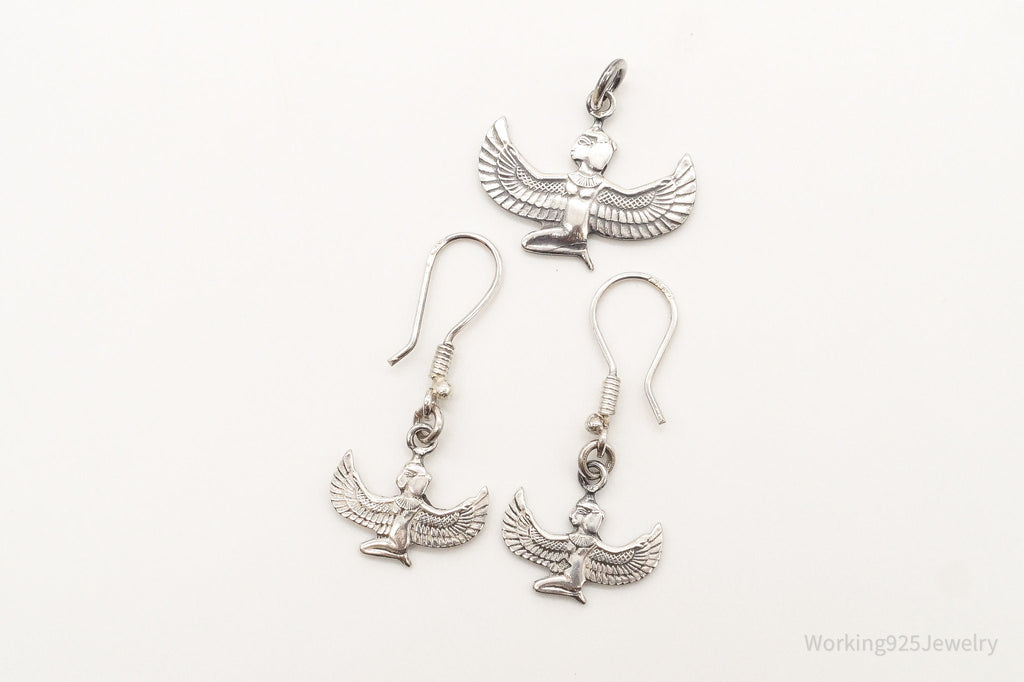 Vintage Egyptian Winged Goddess Isis Sterling Silver Pendant Earrings Set