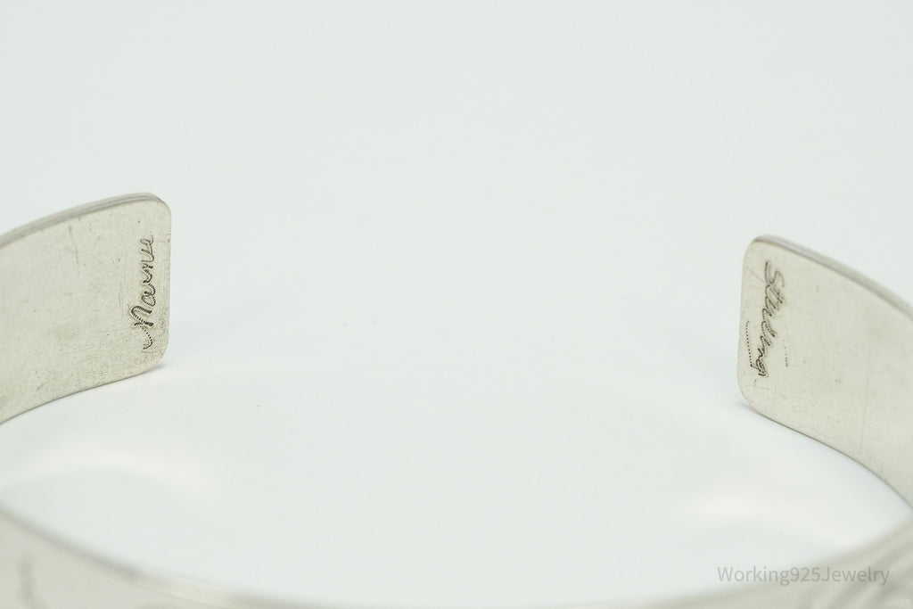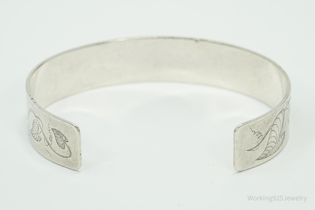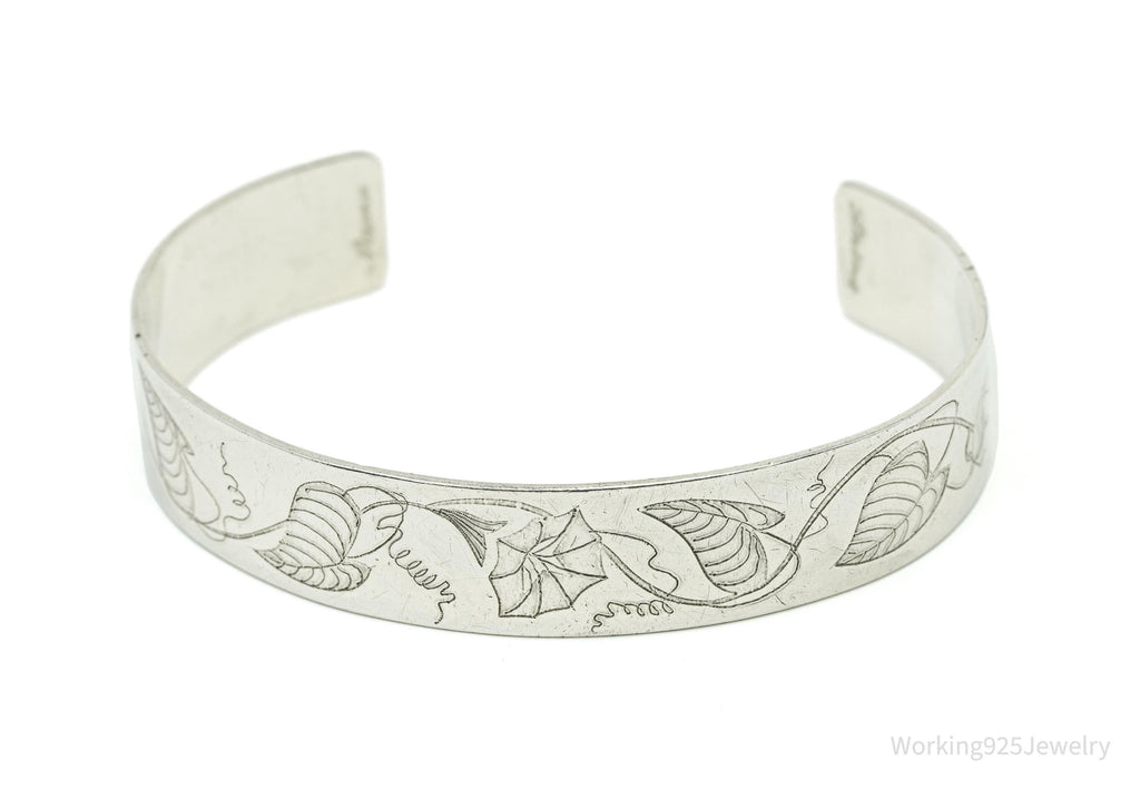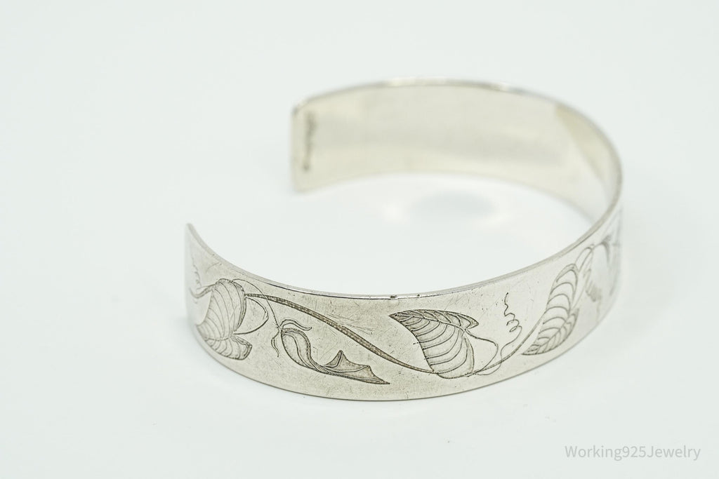 Vintage Floral Pattern Flowers Sterling Silver Cuff Bracelet 6.75"