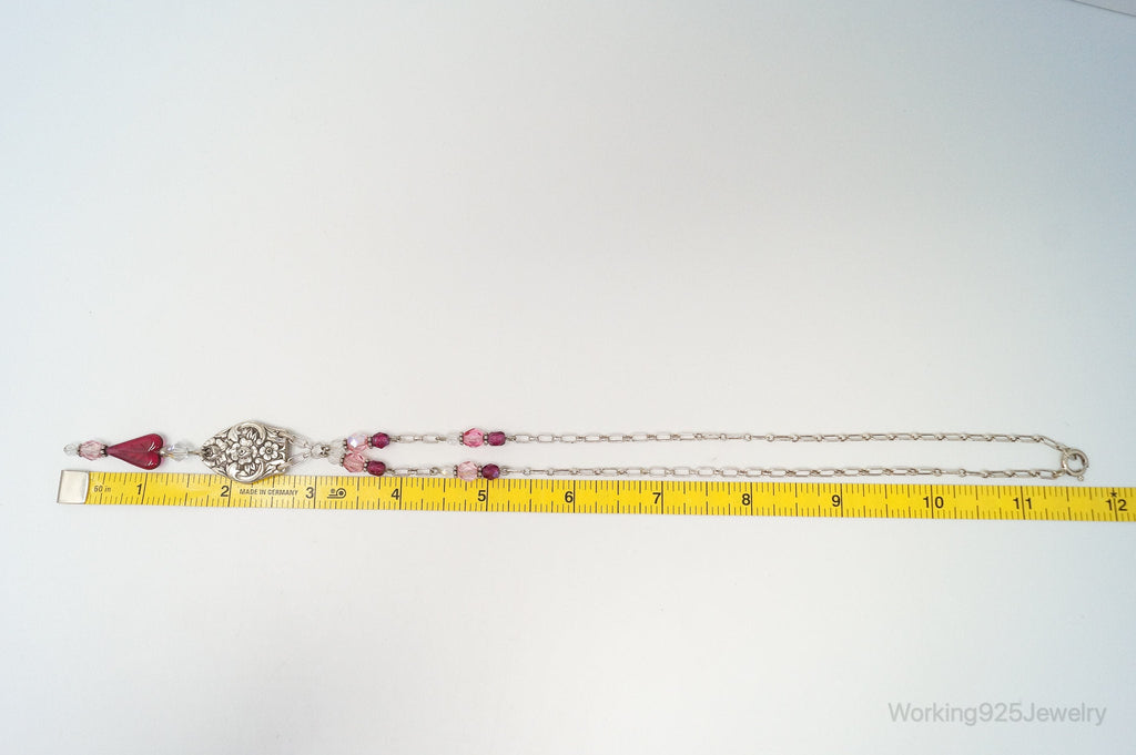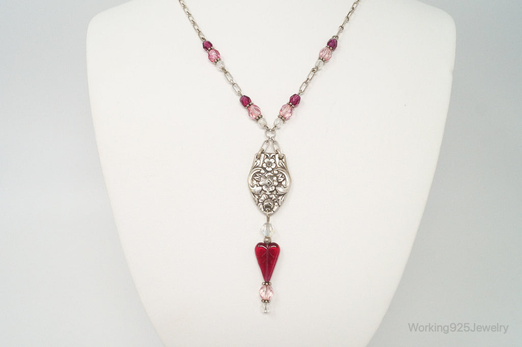 Vintage Floral Spoon Repousse Glass Heart Crystal Sterling Silver Necklace