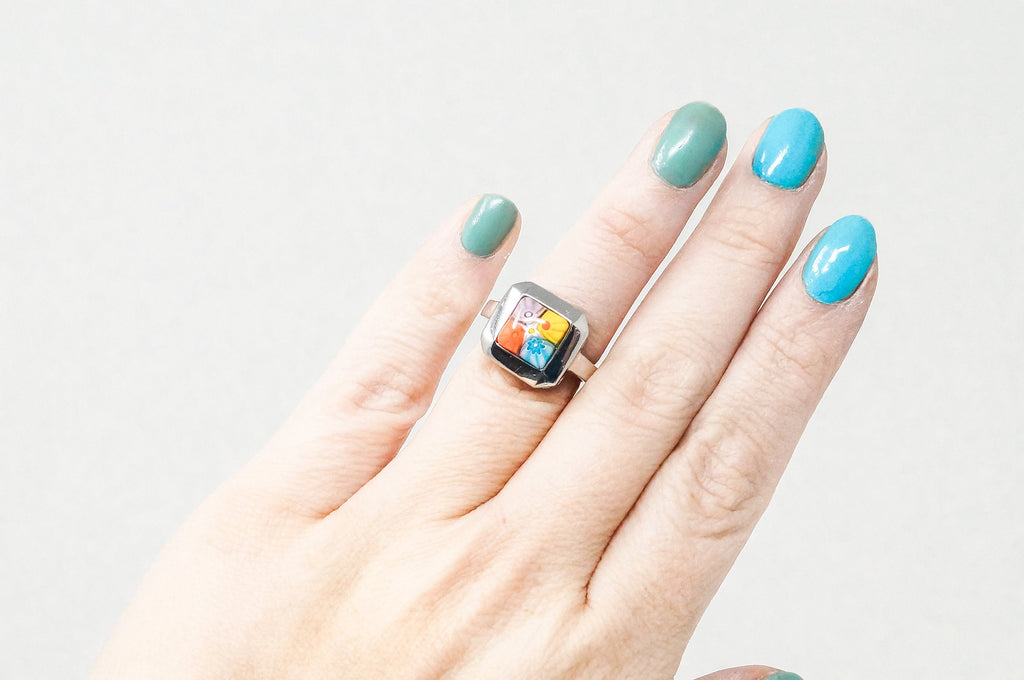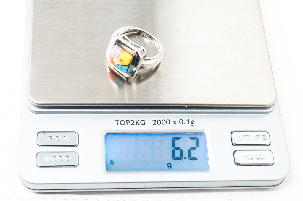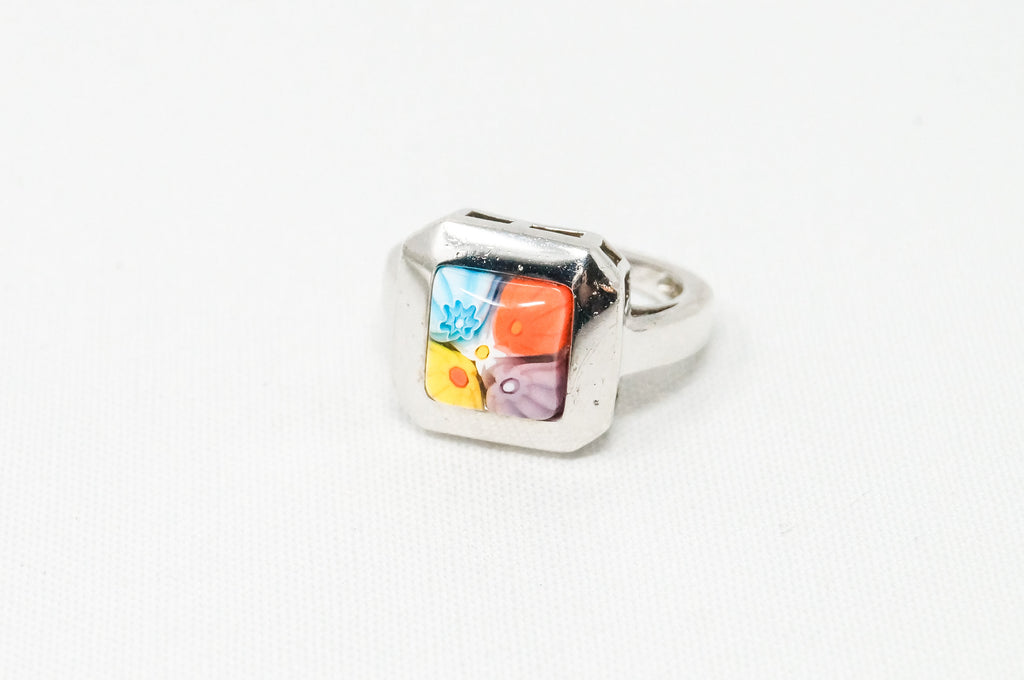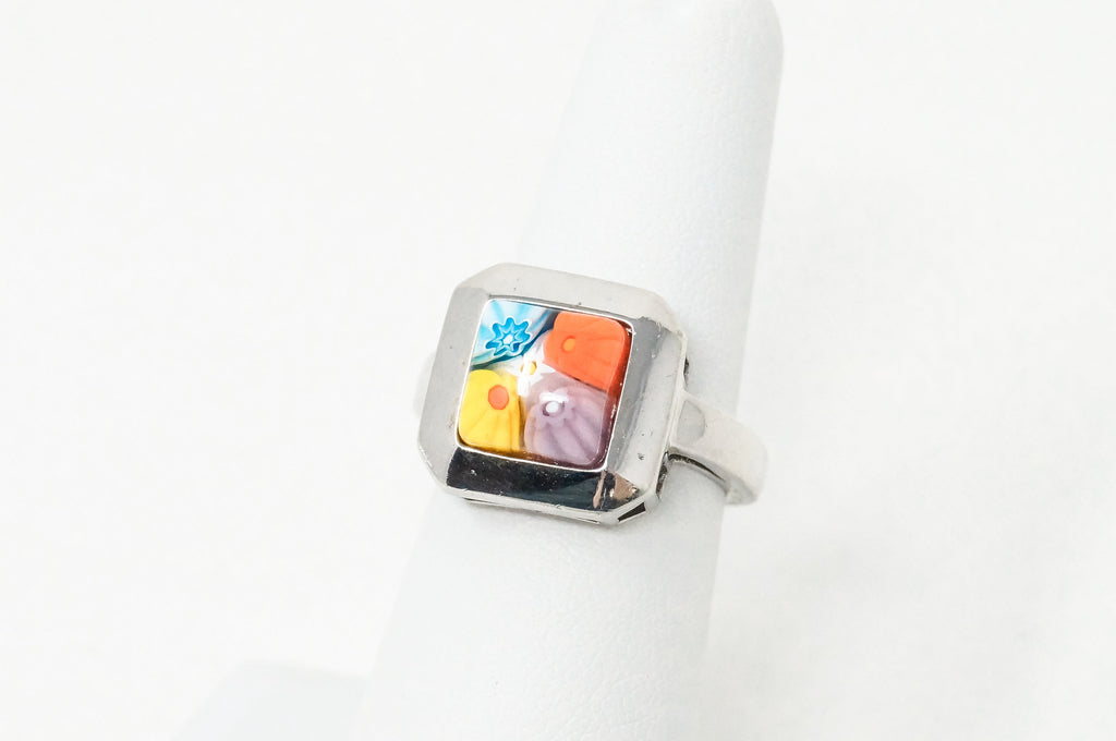 Vintage Glass Murano Millefiori Flowers Sterling Silver Ring - Sz 6