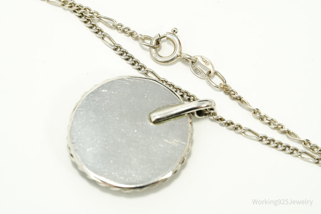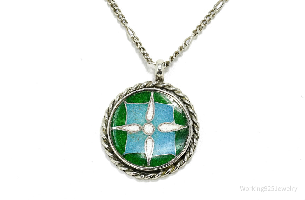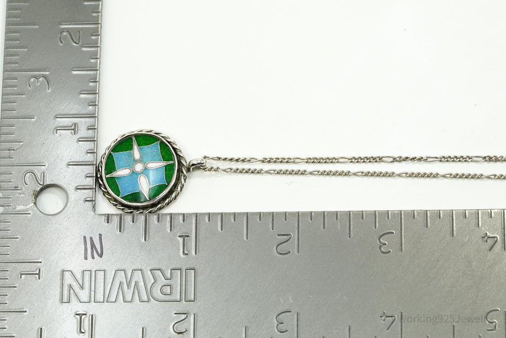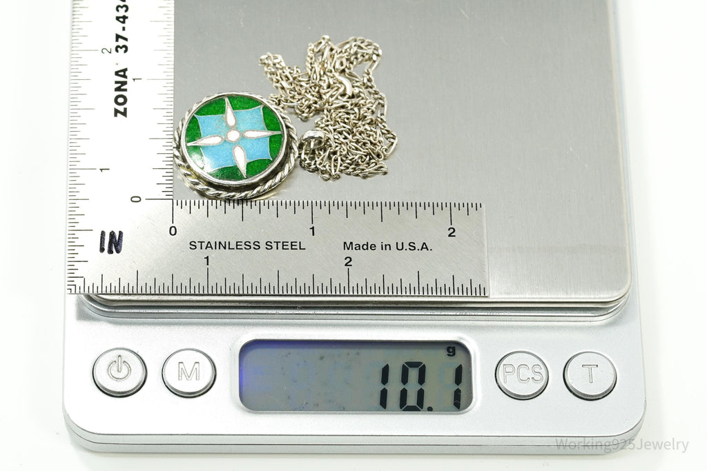 Vintage Green, Blue & White Enamel Inlay Sterling Silver Necklace 18"