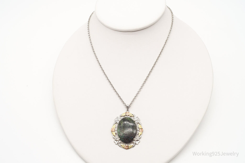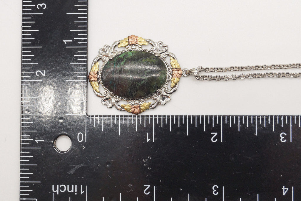 Vintage Green Stone 12K Gold Leaves Sterling Silver Necklace
