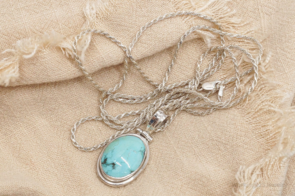 Vintage Large Blue Turquoise Pendant Sterling Silver Necklace 30"