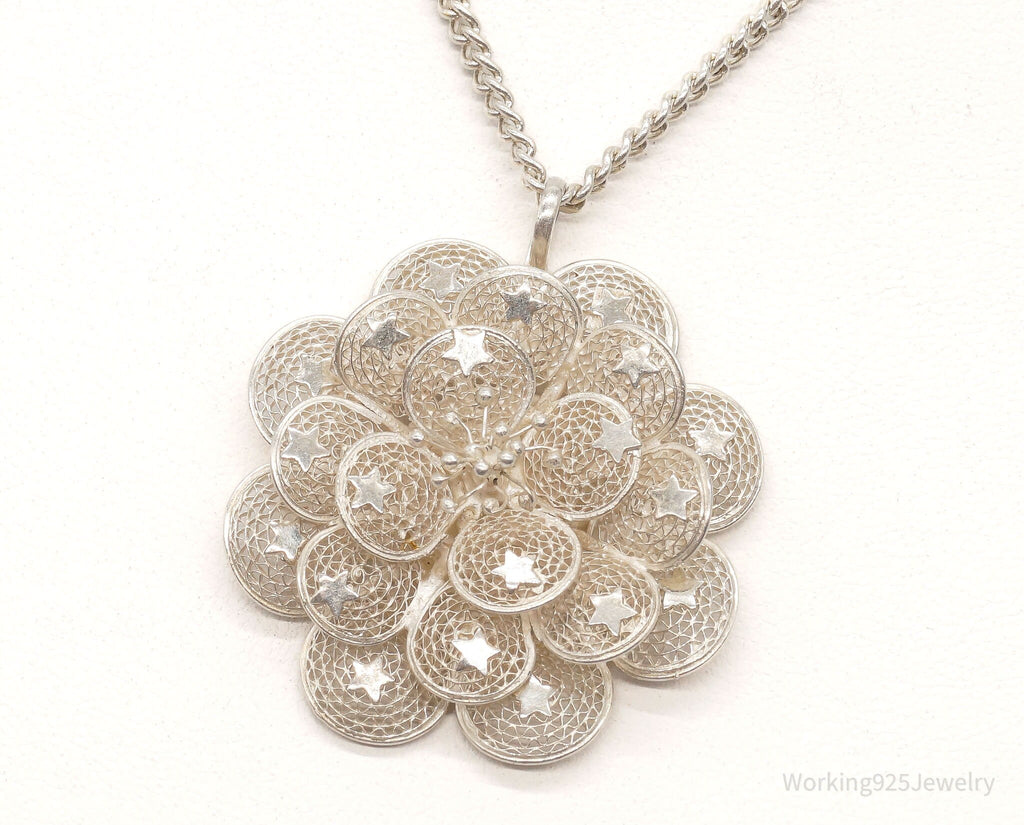 Vintage Large Filigree Flower Star Petals Silver Chain Necklace
