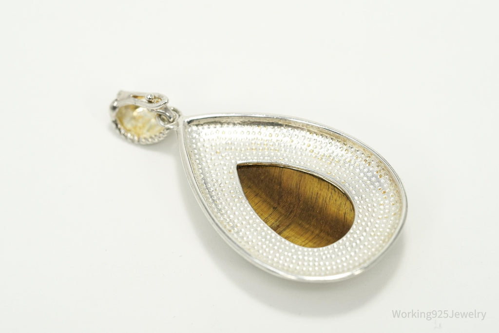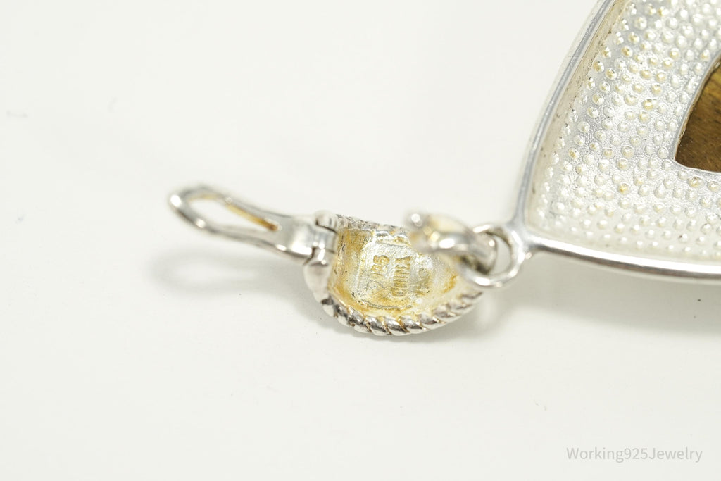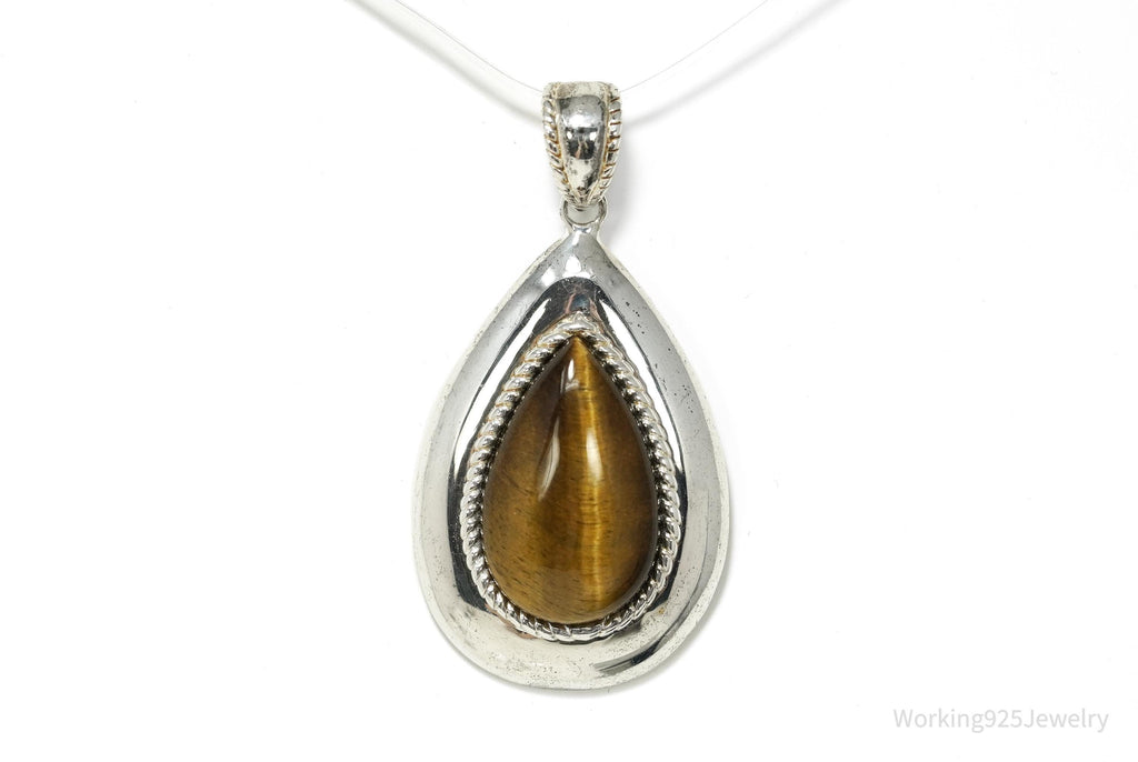 Vintage Large Tigers Eye Sterling Silver Necklace Pendant 2"