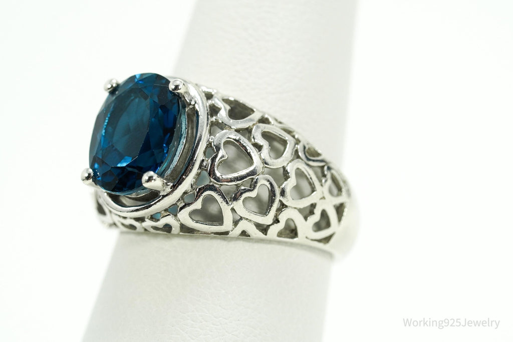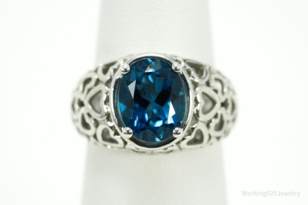 Vintage London Blue Topaz & Hearts Pattern Sterling Silver Ring - Size 6