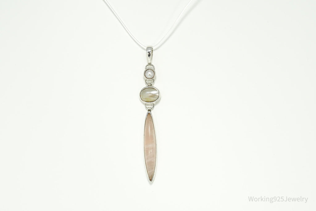 Vintage Rose Quartz Mother Of Pearl & Pearl Sterling Silver Pendant