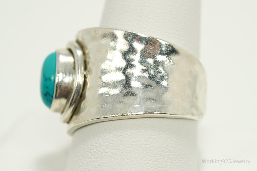 Vintage Turquoise Hammered Style Silver Ring - Size 12