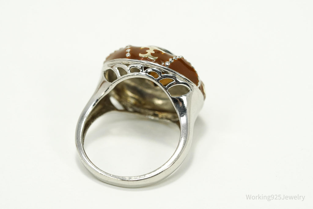 A bold vintage Y2K cocktail ring featuring a rich faceted smoky topaz set in a glossy enamel dome accented with gold vermeil fleur-de-lis motifs and sterling silver beadwork. This oversized statement design reflects the late 1990s-early 2000s love of dramatic dome rings and mixed textures. Measuring a size 8, this ring makes a striking addition to any collection, blending warm brown gemstone tones with luxe enamel and gold details. Perfect for those who love unique vintage statement jewelry with a millennium-era flair.