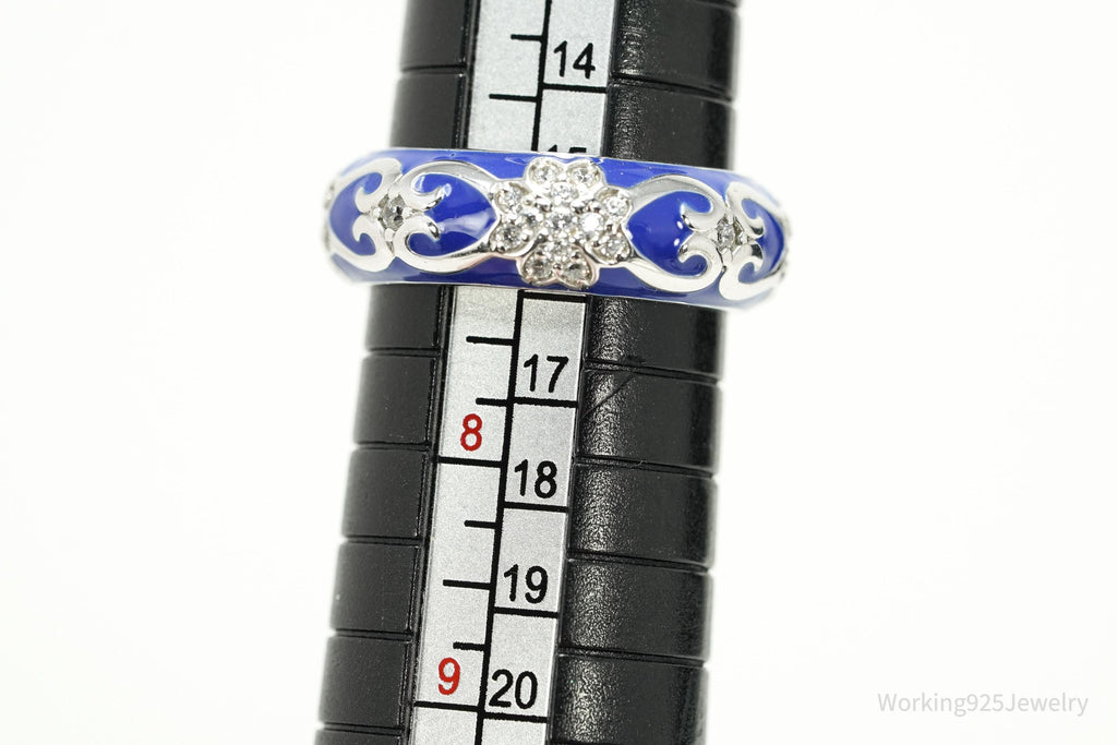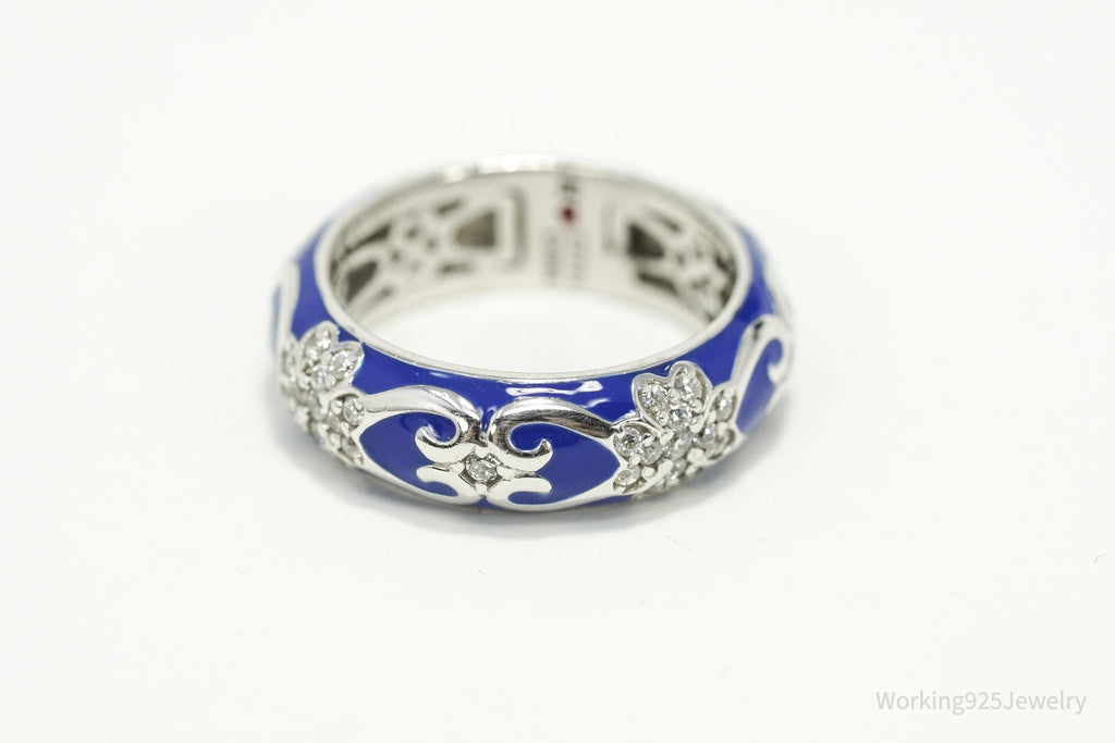 Vintage Cubic Zirconia & Blue Enamel Sterling Silver Ring - Size 7.25