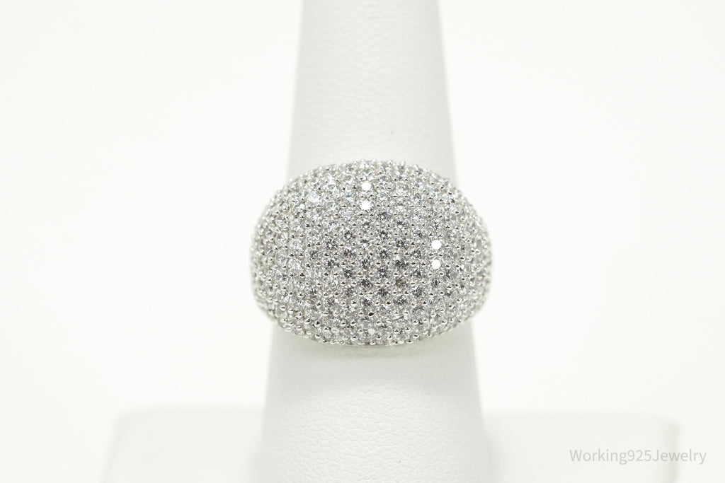 This vintage Italian Milor ring captures the glamorous Y2K aesthetic with its bold dome design, encrusted in a shimmering field of pave-set cubic zirconia. The look is unapologetically sparkly, reminiscent of the cocktail jewelry trends of the late 1990s and early 2000s when oversized, glittering statement rings were essential for night-out style. Crafted in sterling silver, the dome shape gives maximum surface for sparkle, catching the light with every movement. Milor is known for quality Italian craftsmanship, and this piece reflects that attention to detail with a smooth, comfortable fit despite its substantial presence. Size 7.25. A perfect ring for lovers of bold sparkle, Y2K fashion, or anyone wanting a standout piece that feels both vintage and right on trend today.